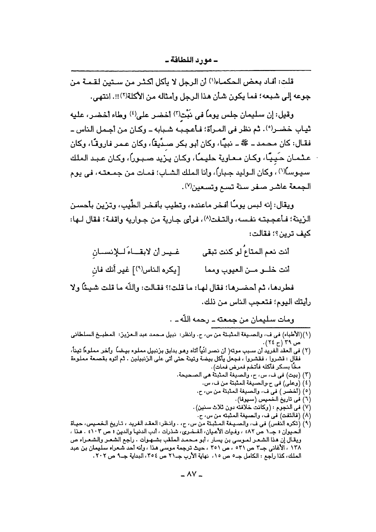 وَقيل: إِن سُلَيْمَان جلس يَوْمًا فِي نبت أَخْضَر على وطاء أَخْضَر، عَلَيْهِ ثِيَاب خضر. ثمَّ نظر فِي الْمرْآة؛ فأعجبه شبابه - وَكَانَ من أجمل النَّاس - فَقَالَ: كَانَ مُحَمَّد -[صلى الله عَلَيْهِ وَسلم]- نَبيا، وَكَانَ أَبُو بكر صديقا، وَكَانَ عمر فاروقا، وَكَانَ عُثْمَان حييا، وَكَانَ مُعَاوِيَة حَلِيمًا، وَكَانَ يزِيد صبورا، وَكَانَ عبد الْملك سيوسا، وَكَانَ الْوَلِيد جبارا، وَأَنا الْملك الشَّاب؛ فَمَاتَ من جمعته، فِي يَوْم الْجُمُعَة عَاشر صفر سنة تسع وَتِسْعين.