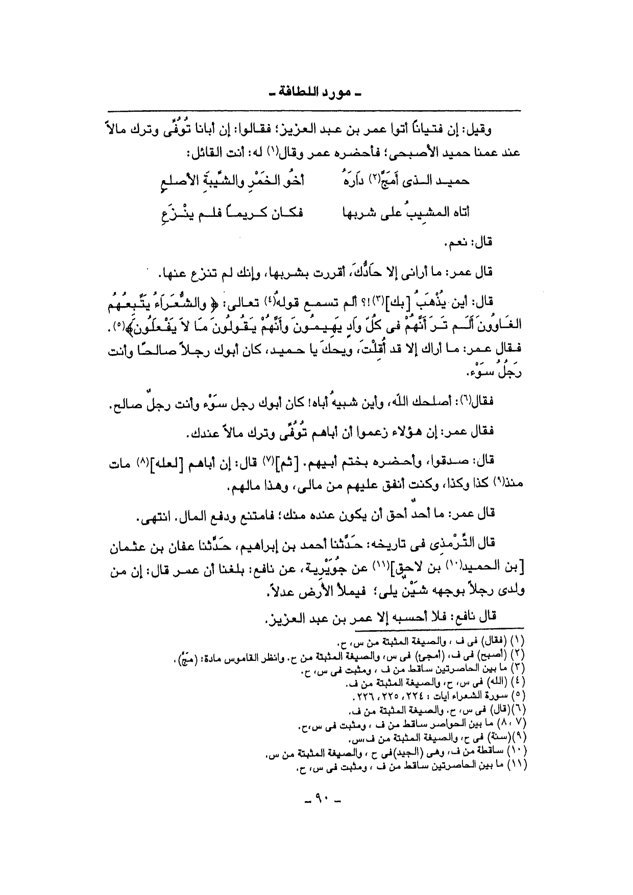 وَقيل: إِن فتيانا أَتَوا عمر بن عبد الْعَزِيز؛ فَقَالُوا: إِن أَبَانَا توفّي وَترك مَالا عِنْد عمنَا حميد الأصبحي؛ فَأحْضرهُ عمر وَقَالَ لَهُ: أَنْت الْقَائِل: