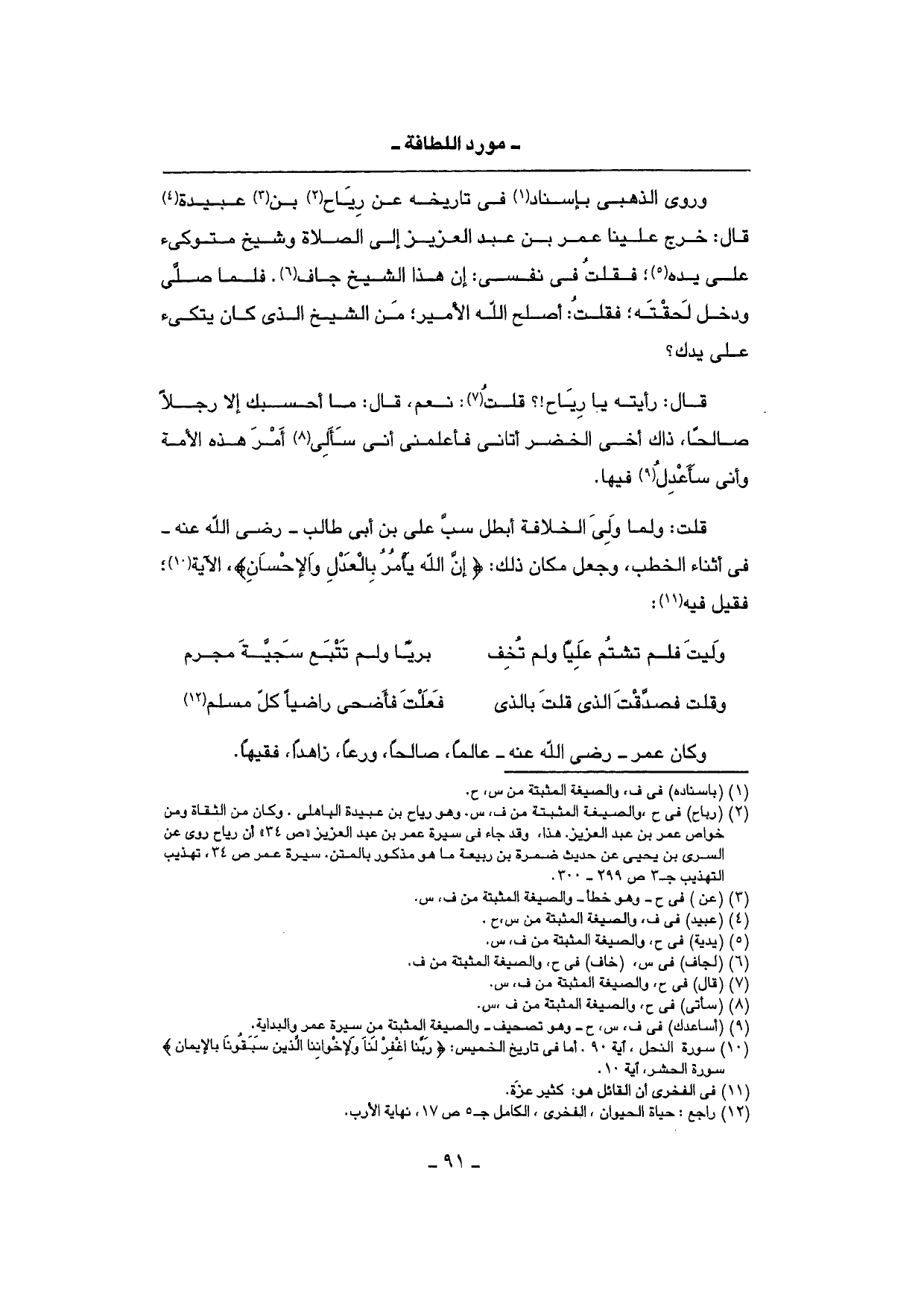 وروى الذَّهَبِيّ بِإِسْنَاد فِي تَارِيخه عَن ريَاح بن عُبَيْدَة قَالَ: خرج علينا عمر بن عبد الْعَزِيز إِلَى الصَّلَاة وَشَيخ متوكئ على يَده؛ فَقلت فِي نَفسِي: إِن هَذَا الشَّيْخ جَاف. فَلَمَّا صلى وَدخل لحقته؛ فَقلت: أصلح الله الْأَمِير؛ من الشَّيْخ الَّذِي كَانَ يتكئ على يدك؟