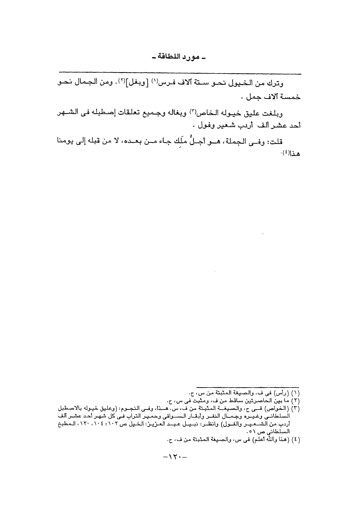وَترك من الْخُيُول نَحْو سِتَّة آلَاف فرس [وبغل] . وَمن الْجمال نَحْو خَمْسَة آلَاف جمل.