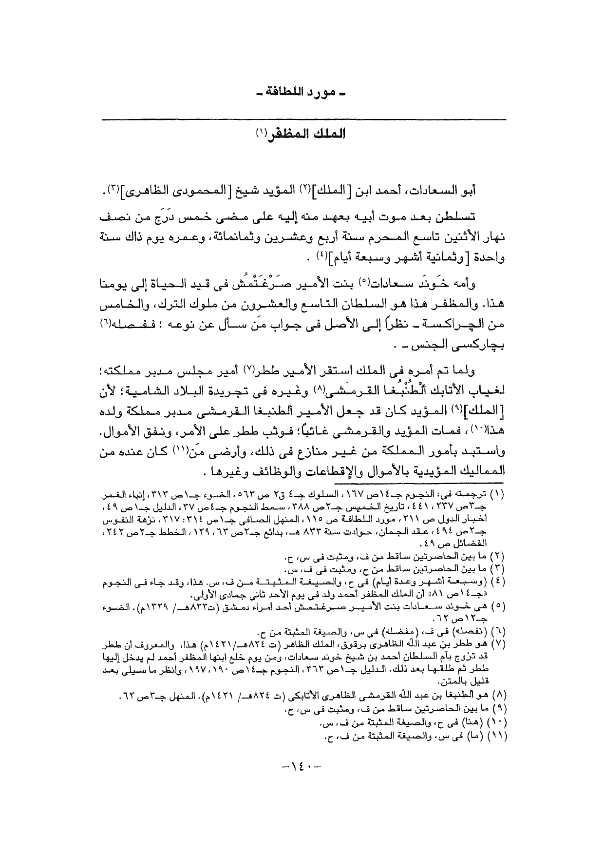 وَأمه خوند سعادات بنت الْأَمِير صرغتمش فِي قيد الْحَيَاة إِلَى يَوْمنَا هَذَا. والمظفر هَذَا هُوَ السُّلْطَان التَّاسِع وَالْعشْرُونَ من مُلُوك التّرْك، وَالْخَامِس من الجراكسة - نظرا إِلَى الأَصْل فِي جَوَاب من سَأَلَ عَن نَوعه؛ ففصله بجاركسي الْجِنْس.