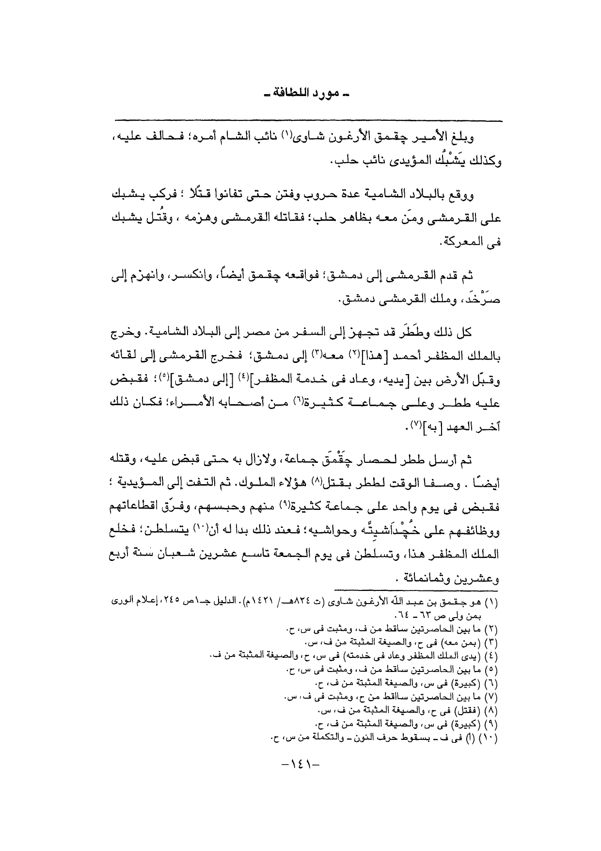 كل ذَلِك وططر قد تجهز إِلَى السّفر من مصر إِلَى الْبِلَاد الشامية. وَخرج بِالْملكِ المظفر أَحْمد [هَذَا] مَعَه إِلَى دمشق؛ فَخرج القرمشي إِلَى لِقَائِه وَقبل الأَرْض بَين [يَدَيْهِ، وَعَاد فِي خدمَة المظفر] [إِلَى دمشق] ؛ فَقبض عَلَيْهِ ططر وعَلى جمَاعَة كَثِيرَة من أَصْحَابه الْأُمَرَاء؛ فَكَانَ ذَلِك آخر الْعَهْد [بِهِ] .