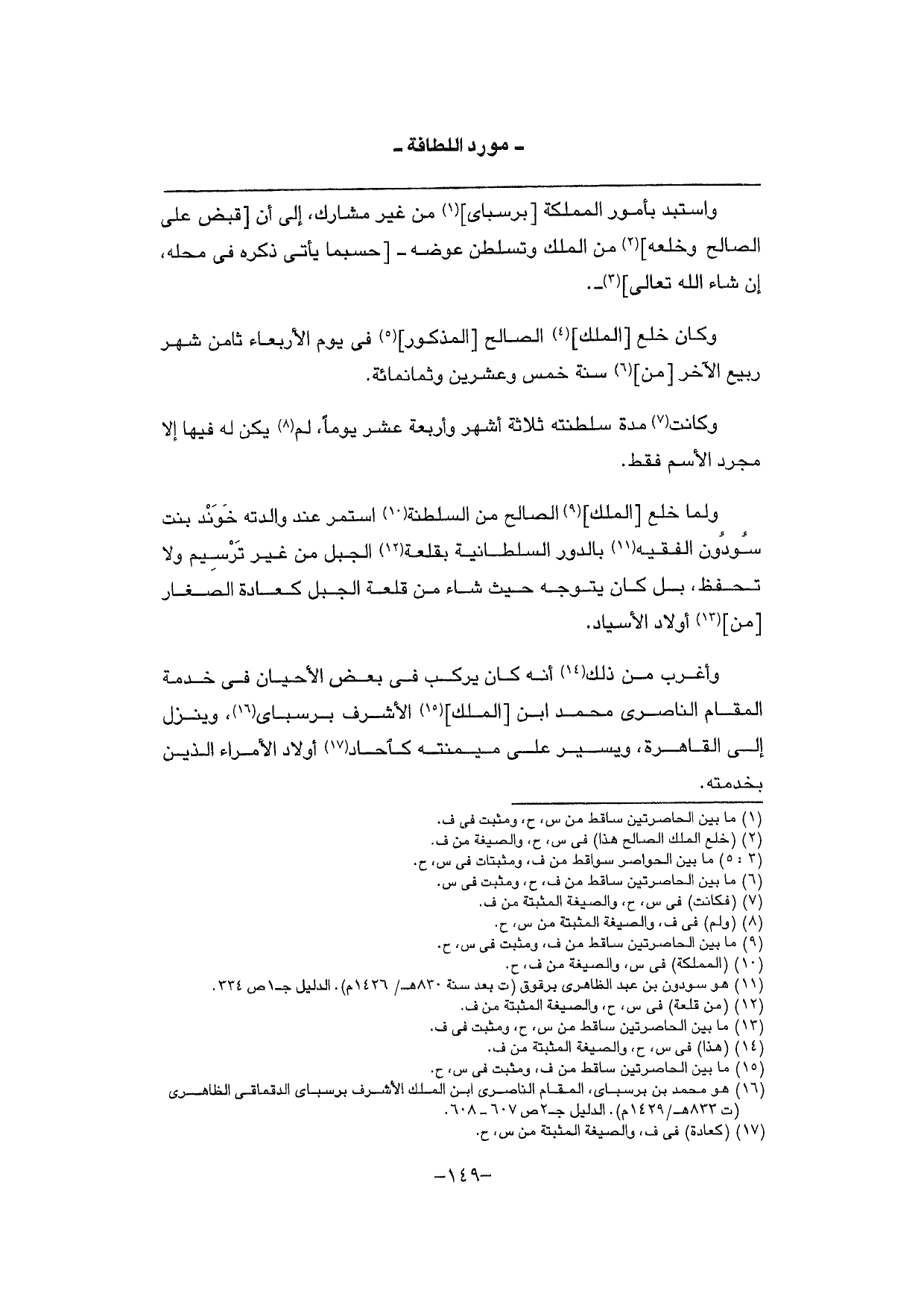 واستبد بِأُمُور المملكة [برسباى] من غير مشارك، إِلَى أَن [قبض على الصَّالح وخلعه] من الْملك وتسلطن عوضه -[حَسْبَمَا يَأْتِي ذكره فِي مَحَله، إِن شَاءَ الله تَعَالَى]-.