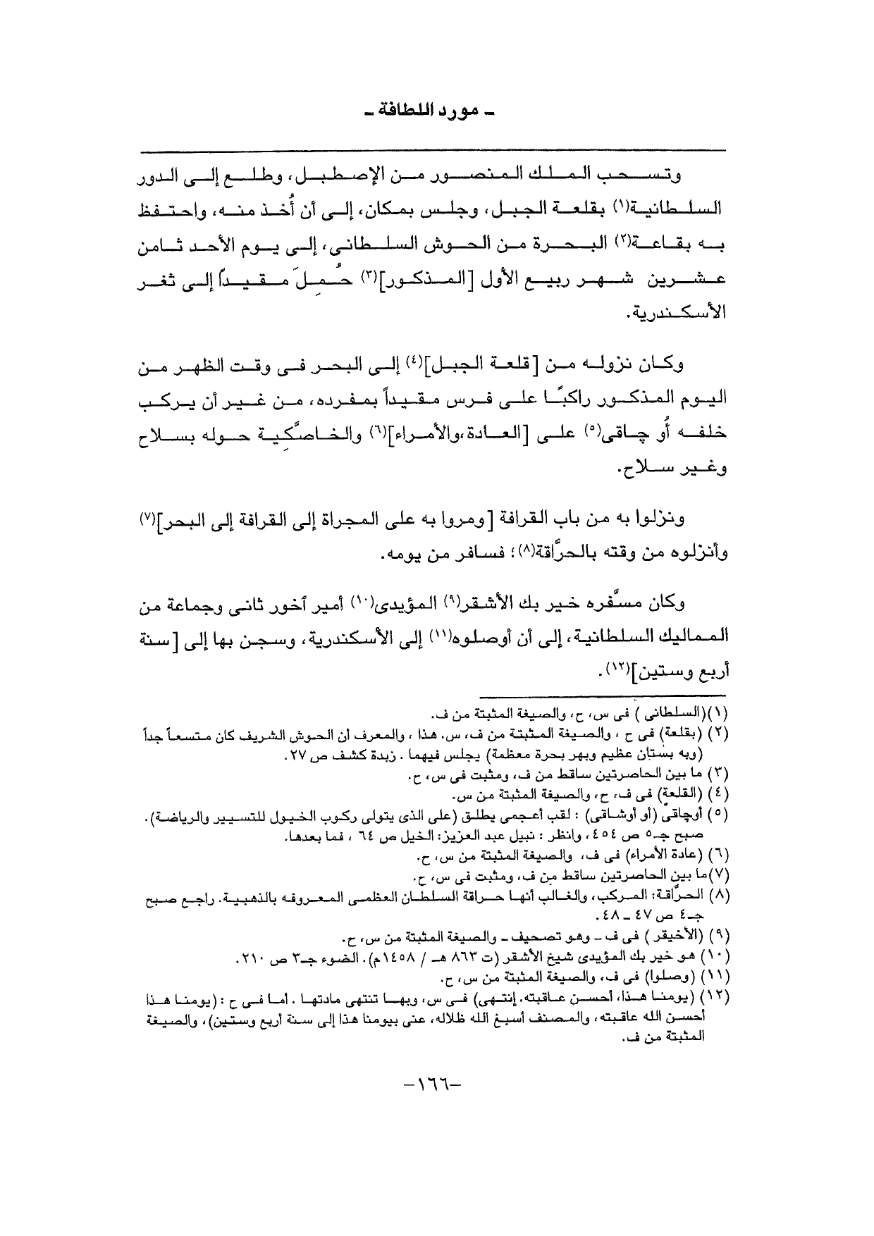وتسحب الْملك الْمَنْصُور من الإصطبل، وطلع إِلَى الدّور السُّلْطَانِيَّة بقلعة الْجَبَل، وَجلسَ بمَكَان، إِلَى أَن أَخذ مِنْهُ، واحتفظ بِهِ بقاعة البحرة من الحوش السلطاني، إِلَى يَوْم الْأَحَد ثامن عشْرين شهر ربيع الأول [الْمَذْكُور] حمل مُقَيّدا إِلَى ثغر الأسكندرية.