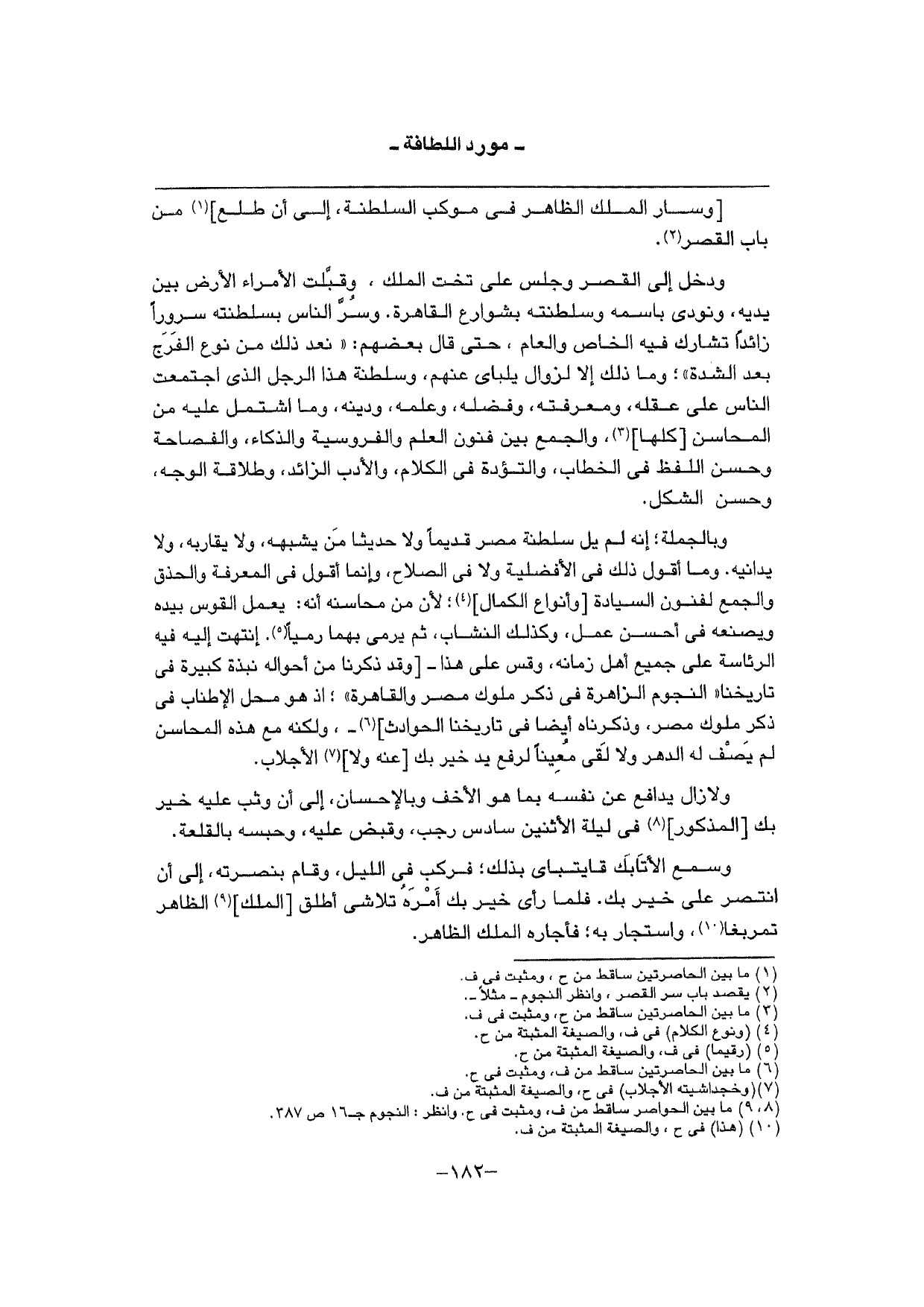 وَبِالْجُمْلَةِ؛ إِنَّه لم يل سلطنة مصر قَدِيما وَلَا حَدِيثا من يُشبههُ، وَلَا يُقَارِبه، وَلَا يدانيه. وَمَا أَقُول ذَلِك فِي الْأَفْضَلِيَّة وَلَا فِي الصّلاح، وَإِنَّمَا أَقُول فِي الْمعرفَة والحذق وَالْجمع لفنون السِّيَادَة [وأنواع الْكَمَال] ؛ لِأَن من محاسنه أَنه: يعْمل الْقوس بِيَدِهِ ويصنعه فِي أحسن عمل، وَكَذَلِكَ النشاب، ثمَّ يَرْمِي بهما رميا. إنتهت إِلَيْهِ فِيهِ الرِّئَاسَة على جَمِيع أهل زَمَانه، وَقس على هَذَا -[وَقد ذكرنَا من أَحْوَاله نبذة كَبِيرَة فِي تاريخنا ((النُّجُوم الزاهرة فِي ذكر مُلُوك مصر والقاهرة)) ؛ إِذْ هُوَ مَحل الاطناب فِي ذكر مُلُوك مصر، وَذَكَرْنَاهُ أَيْضا فِي تاريخنا الْحَوَادِث]-، وَلكنه مَعَ هَذِه المحاسن لم يصف لَهُ الدَّهْر وَلَا لقى معينا لرفع يَد خير بك [عَنهُ وَلَا] الأجلاب.