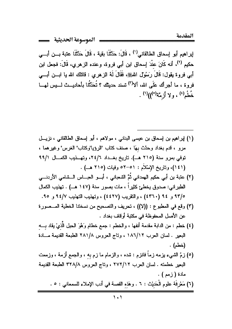 إبراهيم أبو إسحاق الطالقاني (¬١)، قَالَ: حَدَّثنا بقية، قَالَ حَدَّثَنَا عتبة بن أبي حكيم (¬٢)، أنه كَانَ عِنْدَ إسحاق ابن أبي فروة، وعنده الزهري، قَالَ: فجعل ابن أبي فروة يقول: قَالَ رَسُول الله -صلى الله عليه وسلم-، فَقَالَ لَهُ الزهري: قاتلك الله يا ابن أبي فروة، ما أجرأك علَى الله، ألا (¬٣) تسند حديثك؟ تُحَدِّثُنا بأحاديث ليس لها خُطُم (¬٤)، ولا أَزِمَّة (¬٥))) (¬٦).