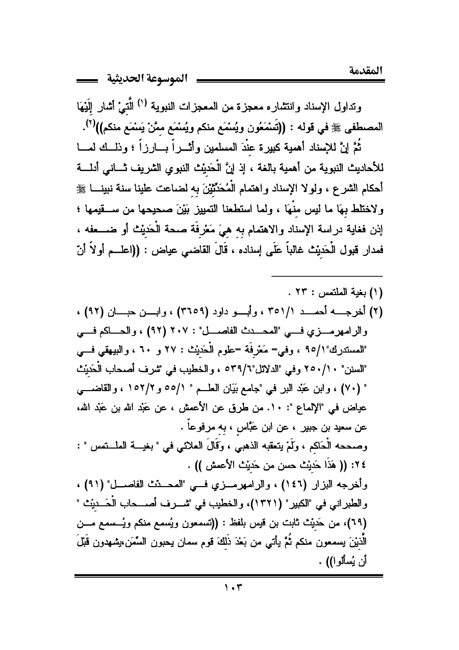 وتداول الإسناد وانتشاره معجزة من المعجزات النبوية (¬١) الَّتِي أشار إِلَيْهَا المصطفى - صلى الله عليه وسلم - في قوله: "تَسْمَعُون ويُسْمَع منكم ويُسْمَع مِمَّنْ يَسْمَع منكم" (¬٢).