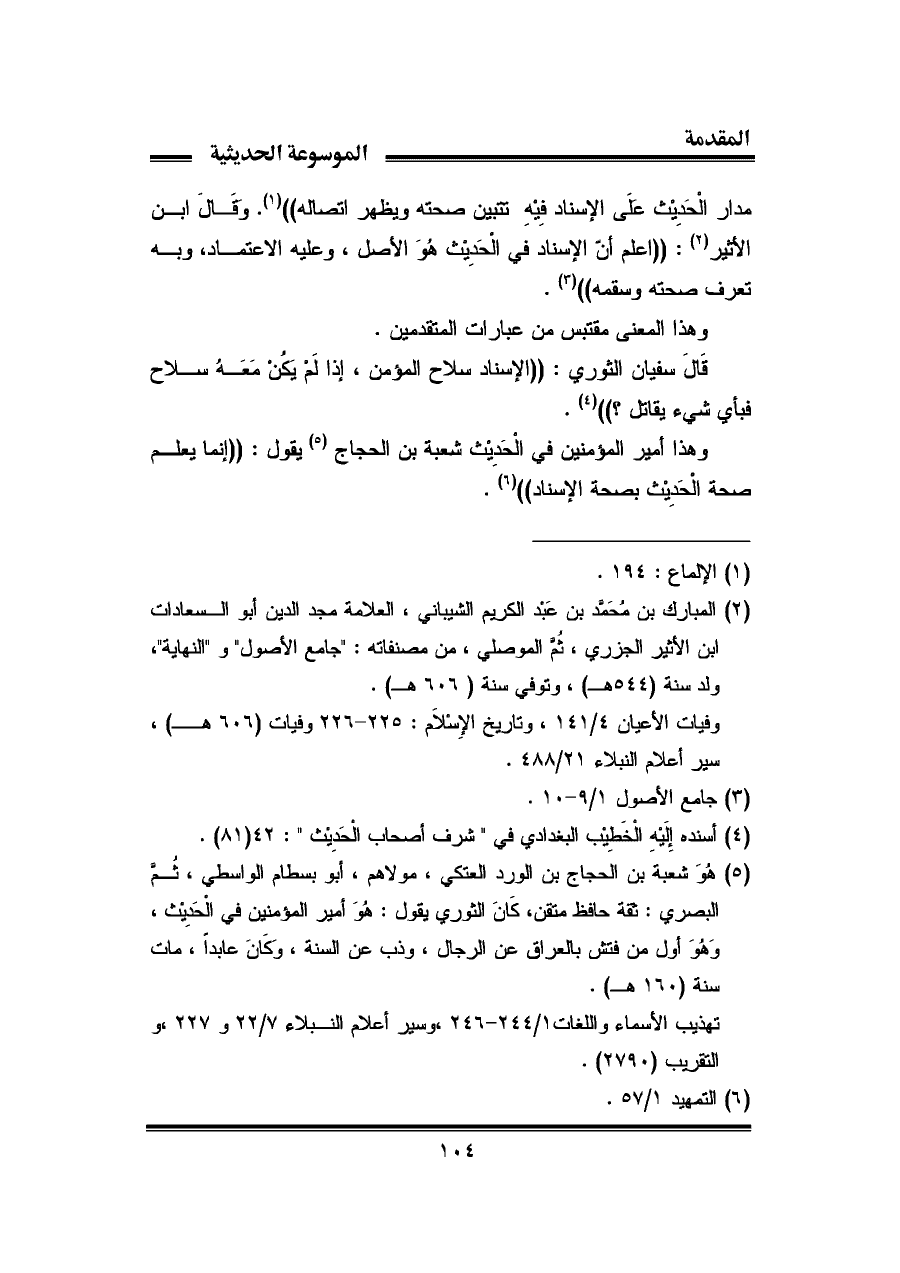 مدار الْحَديْث علَى الإسناد فِيْهِ تتبين صحته ويظهر اتصاله" (¬١). وقالَ ابن الأثير (¬٢). "اعلم أنّ الإسناد في الْحَديْث هُوَ الأصل، وعليه الاعتماد، وبه تعرف صحته وسقمه" (¬٣).