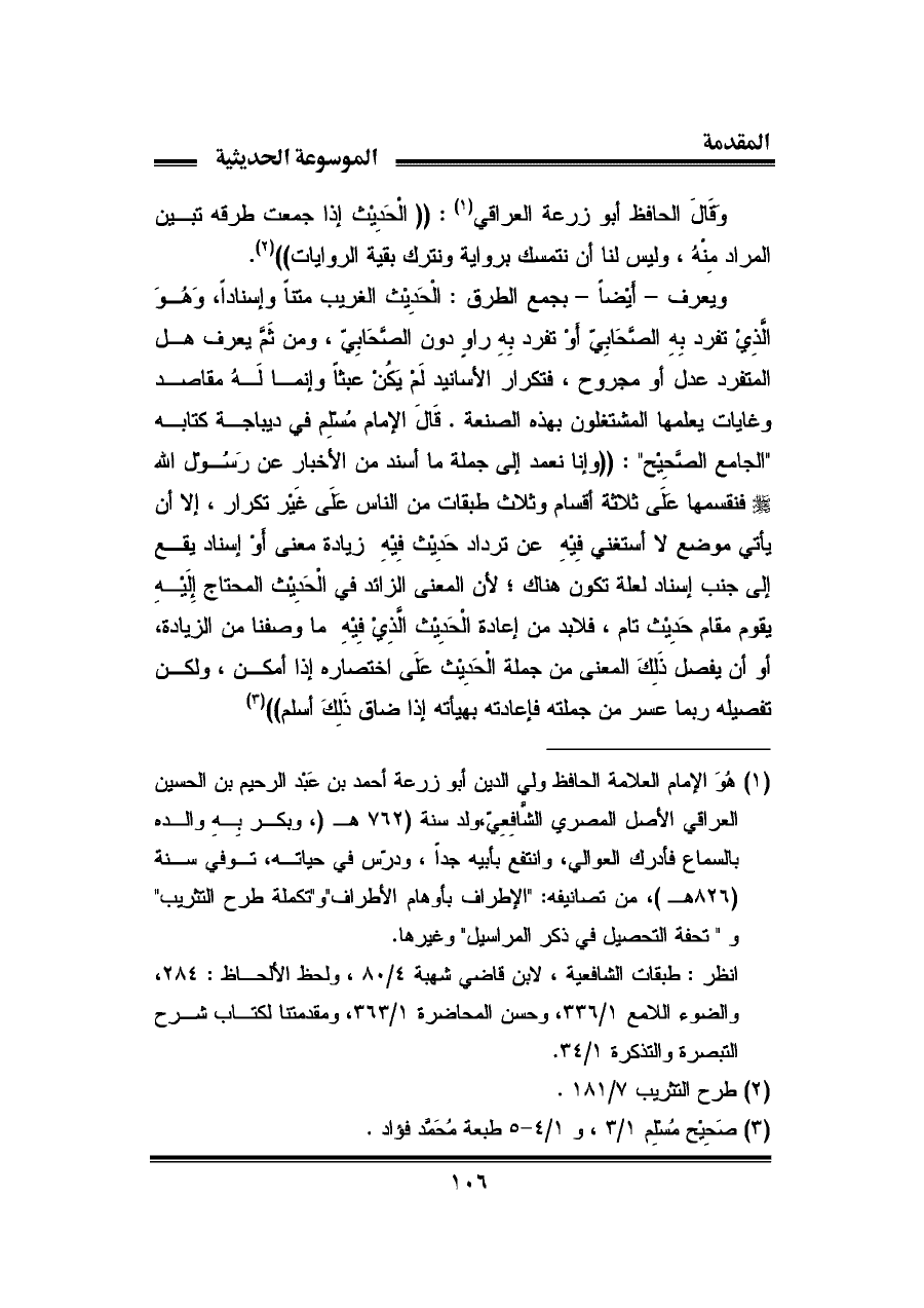ويعرف - أيْضًا - بجمع الطرق: الْحَدِيْث الغريب متنًا وإسنادًا، وَهُوَ الَّذِيْ تفرد بِهِ الصّحَابِيّ أوْ تفرد بِهِ راوٍ دون الصّحَابِيّ، ومن ثَمّ يعرف هل المتفرد عدل أو مجروح، فتكرار الأسانيد لَمْ يَكُنْ عبثًا وإنما لَهُ مقاصد وغايات يعلمها المشتغلون بهذه الصنعة. قَالَ الإمام مُسلِم في ديباجة كتابه "الجامع الصَّحِيْح": "وإنا نعمد إلى جملة ما أسند من الأخبار عن رَسُول الله - صلى الله عليه وسلم - فنقسمها علَى ثلاثة أقسام وثلاث طبقات من الناس علَى غَيْر تكرار، إلا أن يأتي موضع لا أستغني فِيْهِ عن ترداد حَدِيْث فِيْهِ زيادة معنى أَوْ إسناد يقع إلى جنب إسناد لعلة تكون هناك؛ لأن المعنى الزائد في الْحَدِيْث المحتاج إِلَيْهِ يقوم مقام حَدِيْث تام، فلابد من إعادة الْحَدِيْث الَّذِيْ فِيْهِ ما وصفنا من الزيادة، أو أن يفصل ذَلِكَ المعنى من جملة الْحَدِيْث علَى اختصاره إذا أمكن، ولكن تفصيله ربما عسر من جملته فإعادته بهيأته إذا ضاق ذَلِكَ أسلم" (¬٣)