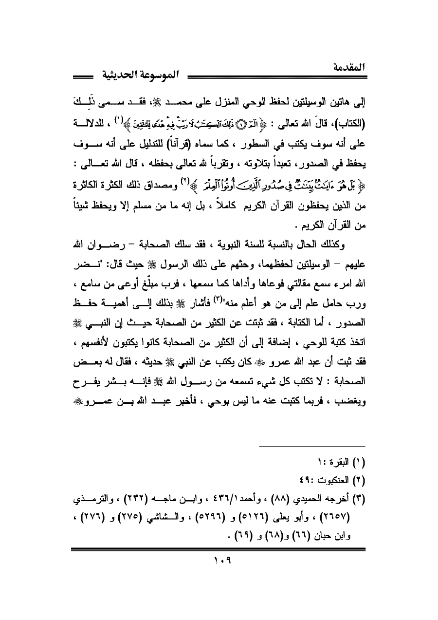 وكذلك الحال بالنسبة للسنة النبوية، فقد سلك الصحابة - رضوان الله عليهم - الوسيلتين لحفظهما، وحثهم على ذلك الرسول - صلى الله عليه وسلم - حيث قال: انضر الله امرء سمع مقالتي فوعاها وأداها كما سمعها، فرب مبلّغ أوعى من سامع، ورب حامل علم إلى من هو أعلم منه" (¬٣) فأشار - صلى الله عليه وسلم - بذلك إلى أهمية حفظ الصدور، أما الكتابة، فقد ثبتت عن الكثير من الصحابة حيث إن النبي - صلى الله عليه وسلم - اتخذ كتبة للوحي، إضافة إلى أن الكثير من الصحابة كانوا يكتبون لأنفسهم، فقد ثبت أن عبد الله عمرو - رضي الله عنه - كان يكتب عن النبي - صلى الله عليه وسلم - حديثه، فقال له بعض الصحابة: لا تكتب كل شيء تسمعه من رسول الله - صلى الله عليه وسلم - فإنه بشر يفرح ويغضب، فربما كتبت عنه ما ليس بوحي، فأخبر عبد الله بن عمرو - رضي الله عنه -