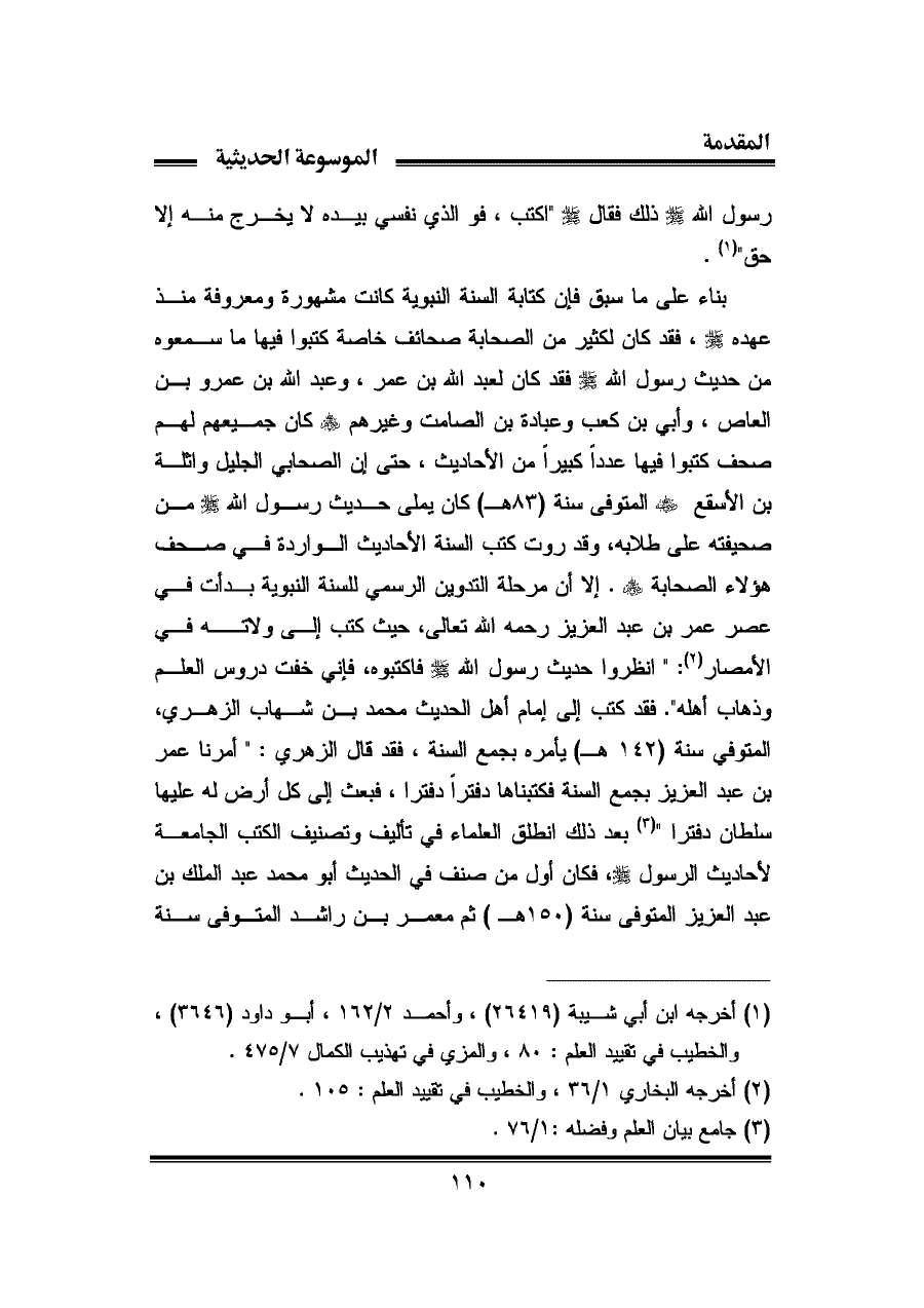 بناء على ما سبق فإن كتابة السنة النبوية كانت مشهورة ومعروفة منذ عهده - صلى الله عليه وسلم -، فقد كان لكثير من الصحابة صحائف خاصة كتبوا فيها ما سمعوه من حديث رسول الله - صلى الله عليه وسلم - فقد كان لعبد الله بن عمر، وعبد الله بن عمرو بن العاص، وأبي بن كعب وعبادة بن الصامت وغيرهم - رضي الله عنه - كان جميعهم لهم صحف كتبوا فيها عددًا كبيرًا من الأحاديث، حتى إن الصحابي الجليل واثلة بن الأسقع - رضي الله عنه - المتوفى سنة (٨٣ هـ) كان يملى حديث رسول الله - صلى الله عليه وسلم - من صحيفته على طلابه، وقد روت كتب السنة الأحاديث الواردة في صحف هؤلاء الصحابة - رضي الله عنهم -. إلا أن مرحلة التدوين الرسمي للسنة النبوية بدأت في عصر عمر بن عبد العزيز رحمه الله تعالى، حيث كتب إلى ولاته في الأمصار (¬٢): "انظروا حديث رسول الله - صلى الله عليه وسلم - فاكتبوه، فإني خفت دروس العلم وذهاب أهله". فقد كتب إلى إمام أهل الحديث محمد بن شهاب الزهري، المتوفي سنة (١٤٢ هـ) يأمره بجمع السنة، فقد قال الزهري: "أمرنا عمر بن عبد العزبز بجمع السنة فكتبناها دفترًا دفترا، فبعث إلى كل أرض له عليها سلطان دفترا" (¬٣) بعد ذلك انطلق العلماء في تأليف وتصنيف الكتب الجامعة لأحاديث الرسول - صلى الله عليه وسلم -، فكان أول من صنف في الحديث أبو محمد عبد الملك بن عبد العزيز المتوفى سنة (١٥٠ هـ) ثم معمر بن راشد المتوفى سنة