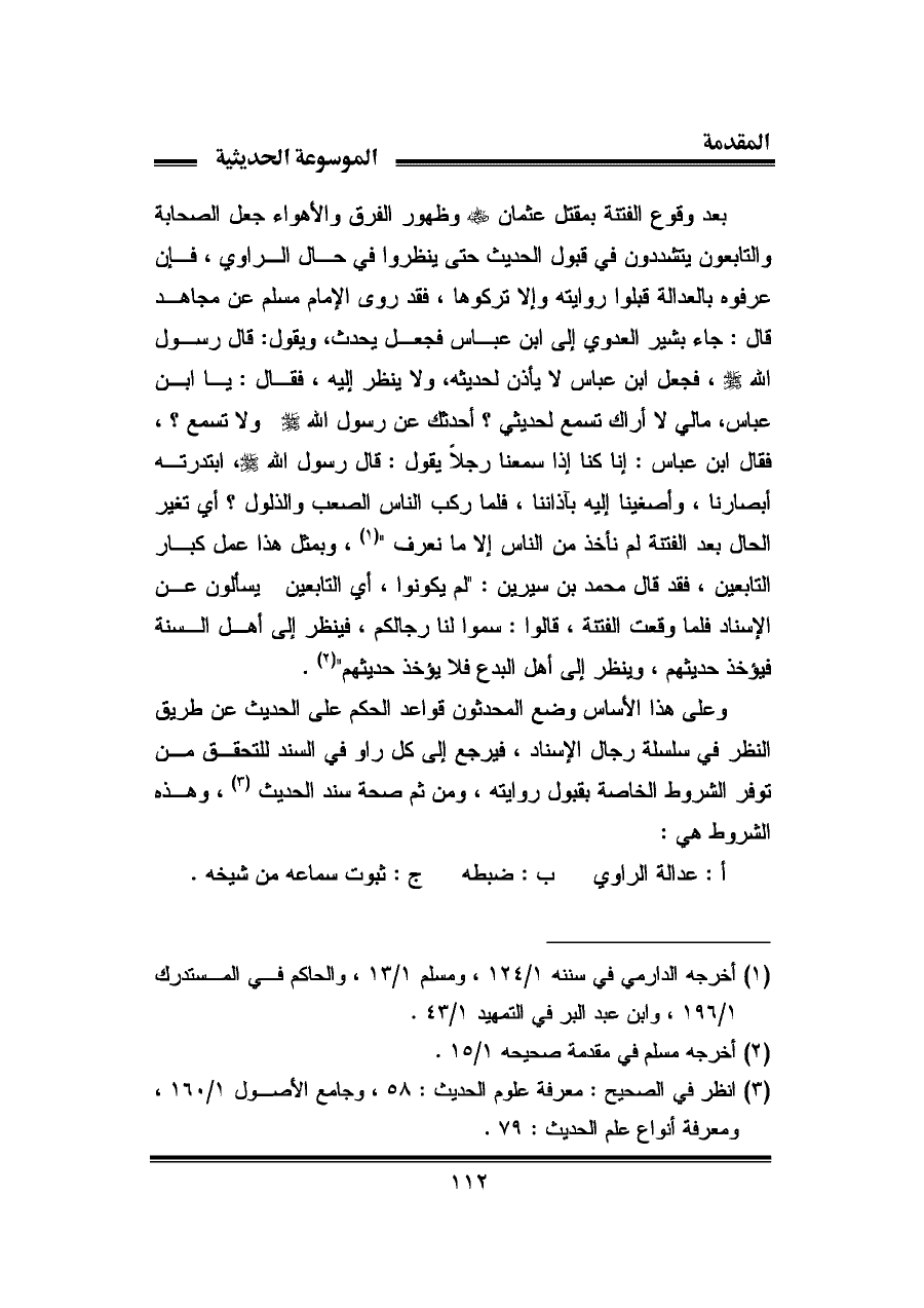 (¬١) أخرجه الدارمي في سننه ١/ ١٢٤، ومسلم ١/ ١٣، والحاكم في المستدرك ١/ ١٩٦، وابن عبد البر في التمهيد ١/ ٤٣.