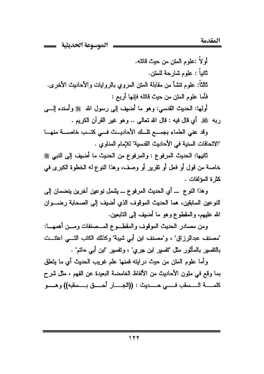 ثانيها: الحديث المرفوع: والمرفوع من الحديث ما أضيف إلى النبي - صلى الله عليه وسلم - خاصة من قول أو فعل أو تقرير أو وصف، وهذا النوع له الخطوة الكبرى في كثرة المؤلفات.