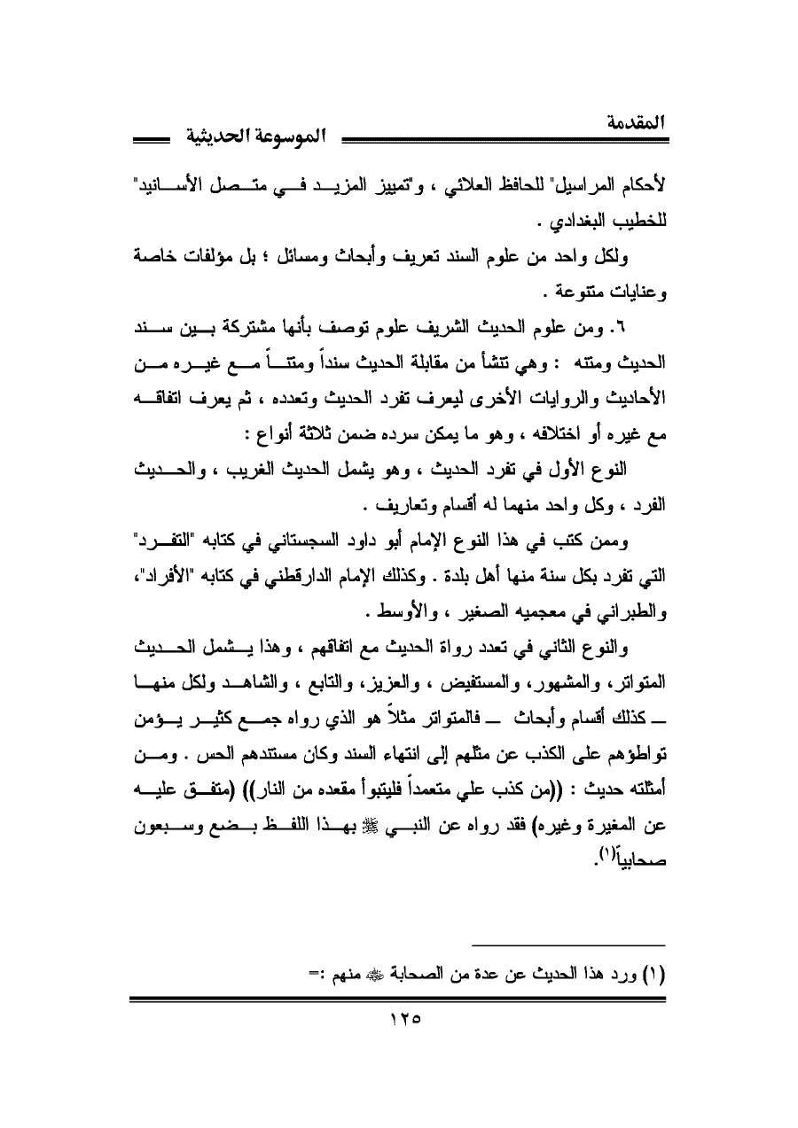 ولكل واحد من علوم السند تعريف وأبحاث ومسائل؛ بل مؤلفات خاصة وعنايات متنوعة.
