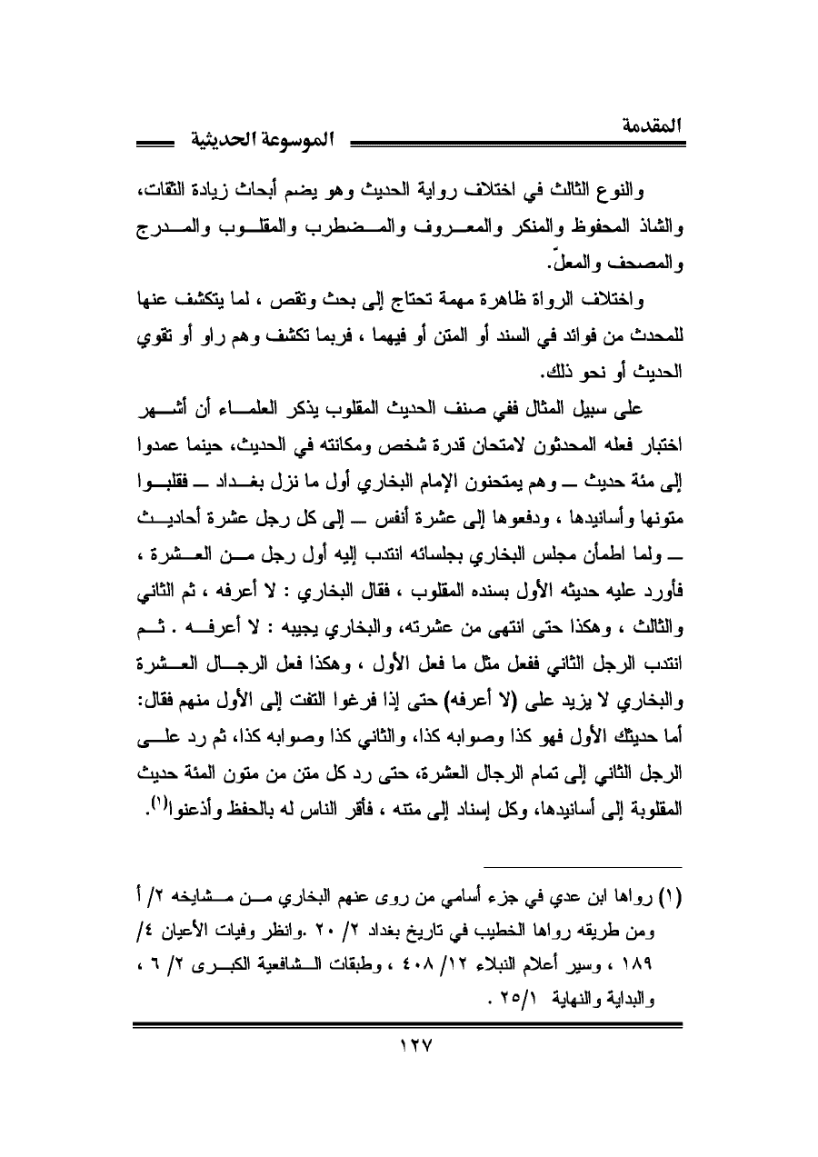على سبيل المثال ففي صنف الحديث المقلوب يذكر العلماء أن أشهر اختبار فعله المحدثون لامتحان قدرة شخص ومكانته في الحديث، حينما عمدوا إلى مئة حديث - وهم يمتحنون الإمام البخاري أول ما نزل بغداد - فقلبوا متونها وأسانيدها، ودفعوها إلى عشرة أنفس - إلى كل رجل عشرة أحاديث - ولما اطمأن مجلس البخاري بجلسائه انتدب إليه أول رجل من العشرة، فأورد عليه حديثه الأول بسنده المقلوب، فقال البخاري: لا أعرفه، ثم الثاني والثالث، وهكذا حتى انتهى من عشرته، والبخاري يجيبه: لا أعرفه. ثم انتدب الرجل الثاني ففعل مثل ما فعل الأول، وهكذا فعل الرجال العشرة والبخاري لا يزيد على (لا أعرفه) حتى إذا فرغوا التفت إلى الأول منهم فقال: أما حديثك الأول فهو كذا وصوابه كذا، والثاني كذا وصوابه كذا، ثم رد على الرجل الثاني إلى تمام الرجال العشرة، حتى رد كل متن من متون المئة حديث المقلوبة إلى أسانيدها، وكل إسناد إلى متنه، فأقر الناس له بالحفظ وأذعنوا (¬١).
