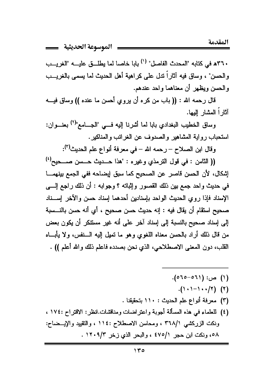 ٣٦٠ هـ في كتابه "المحدث الفاصل" (¬١) بابا خاصا لما يطلق عليه "الغريب والحسن"، وساق فيه آثارًا تدل على كراهية أهل الحديث لما يسمى بالغريب والحسن ويظهر أن معناهما واحد عندهم.