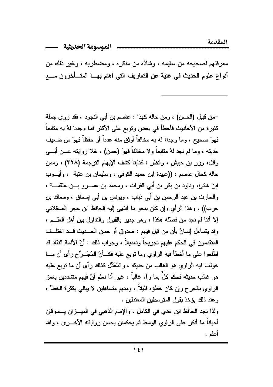 = من قبيل (الحسن)، ومن حاله كهذا: عاصم بن أبي النجود، فقد روى جملة كثيرة من الأحاديث فأخطأ في بعض وتوبع على الأكثر فما وجدنا لهُ به متابعًا فهو صحيح، وما وجدنا لهُ به مخالفًا أوثق منه عددًا أو حفظًا فهوَ من ضعيف حديثه، وما لم نجد لهُ متابعًا ولا مخالفًا فهوَ (حسن)، خلا روايته عن أبي وائل، وزر بن حبيش، وانظر: كتابنا كشف الإيهام الترجمة (٣٢٨)، وممن حاله كحال عاصم: "عبيدة بن حميد الكوفي، وسليمان بن عتبة، وأيوب بن هانئ وداود بن بكر بن أبي الفرات، ومحمد بن عمرو بن علقمة، والحارث بن عبد الرحمن بن أبي ذباب، ويونس بن أبي إسحاق، وسماك بن حرب"، وهذا الرأى وإن كان بنحو ما انتهى أبيه الحافظ ابن حجر العسقلاني إلا أننا لم نجد من فصّله هكذا، وهو جدير بالقبول والتداول بين أهل العلم، وقد يتساءل إنسانٌ بأن من قيل فيهم: صدوق أو حسن الحديث قد اختلف المتقدمون في الحكم عليهم تجريحًا وتعديلًا، وجواب ذلك: أنّ الأئمة النقاد قد اطّلعوا على ما أخطأ فيه الراوي وما توبع عليه فكان المُجَرِّح رأى أن ما خولف فيه الراوي هو الغالب من حديثه، والمُعَدِّل كذلك رأى أن ما توبع عليه هو غالب حديثه فحكم كلٌّ بما رأه غالبًا، غير أنا نعلم أنَّ فيهم متشددين يغمز الراوي بالجرح وإن كان خطؤه قليلًا، ومنهم متساهلين لا يبلي بكثرة الخطأ، وعند ذلك يؤخذ بقول المتوسطين المعتدلين.