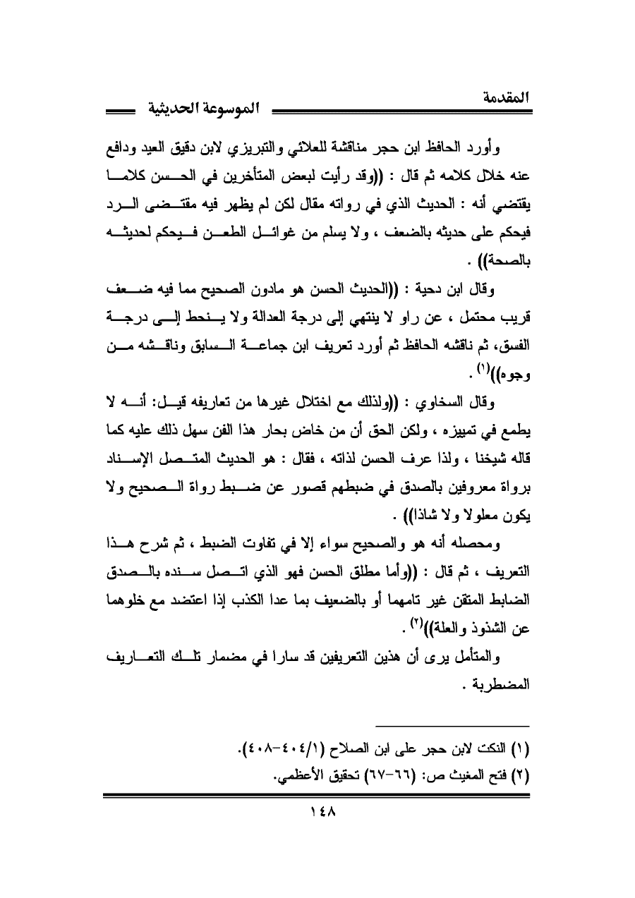 وقال ابن دحية: "الحديث الحسن هو ما دون الصحيح مما فيه ضعف قريب محتمل، عن راو لا ينتهي إلى درجة العدالة ولا ينحط إلى درجة الفسق، ثم ناقشه الحافظ ثم أورد تعريف ابن جماعة السابق وناقشه من وجوه" (¬١).