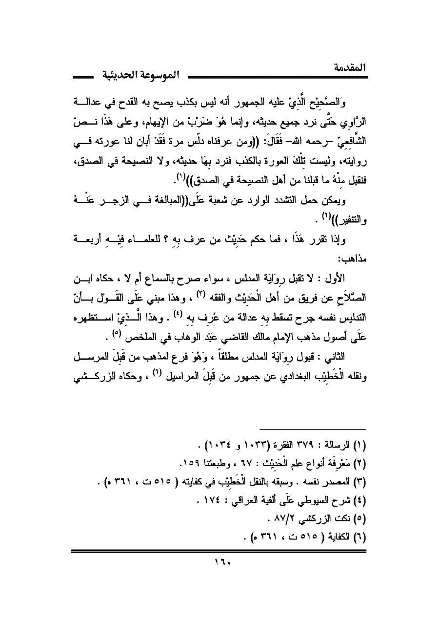 وَالصَّحِيْح الّذِي عليه الجمهور أنه ليس بكذب يصح به القدح في عدالة الرَّاوِي حتَّى نرد جميع حديثه، وإنما هُوَ ضَرْبٌ من الإيهام، وعلى هَذَا نصّ الشَّافِعِيّ - رحمه الله - فَقَالَ: "ومن عرفناه دلّس مرة فَقَدْ أبان لنا عورته في روايته، وليست تِلْكَ العورة بالكذب فنرد بِهَا حديثه، ولا النصيحة في الصدق، فنقبل مِنْهُ ما قبلنا من أهل النصيحة في الصدق" (¬١).