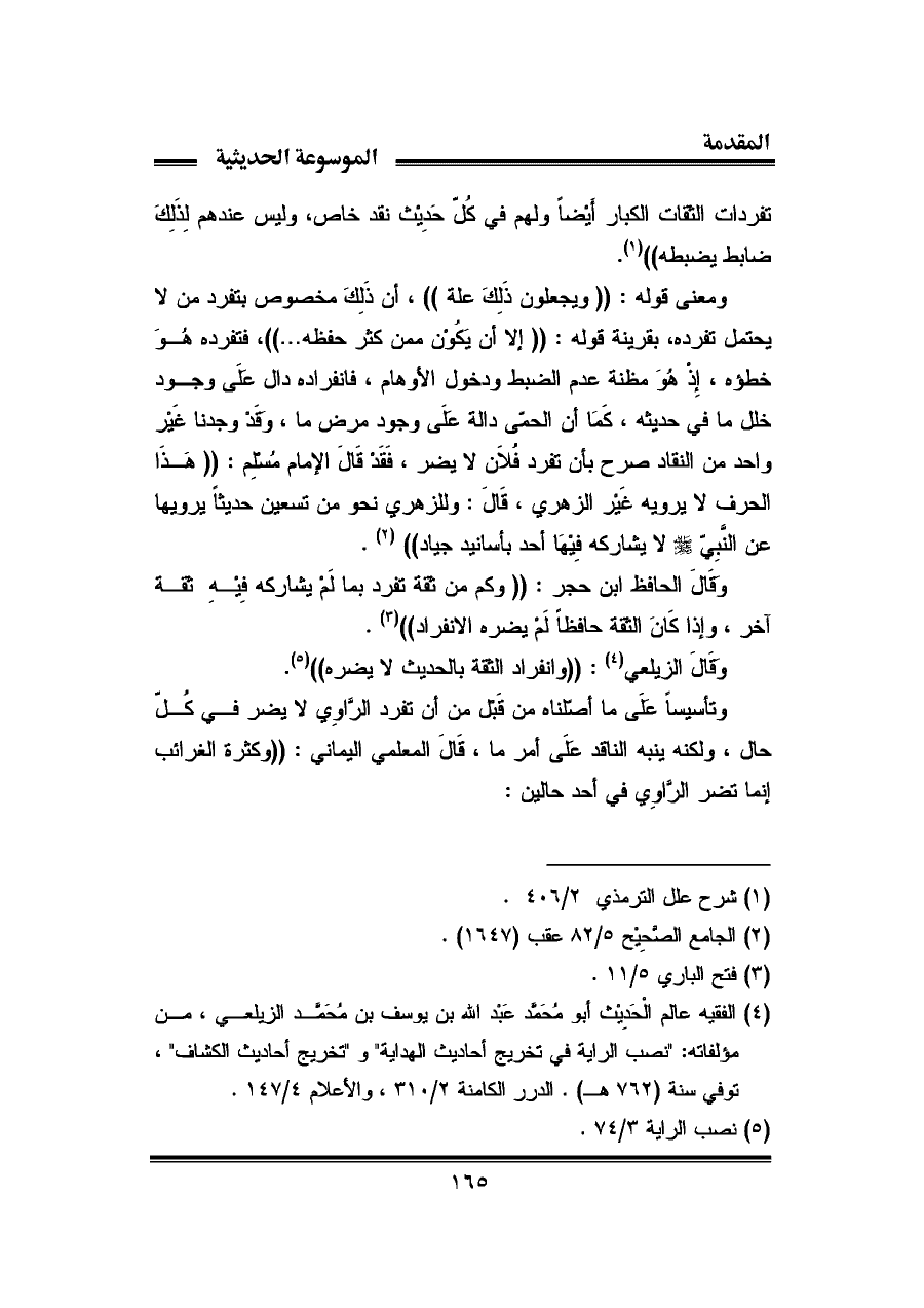 تفردات الثقات الكبار أيْضًا ولهم في كُلّ حَديْث نقد خاص، وليس عندهم لذلكَ ضابط يضبطه" (¬١).