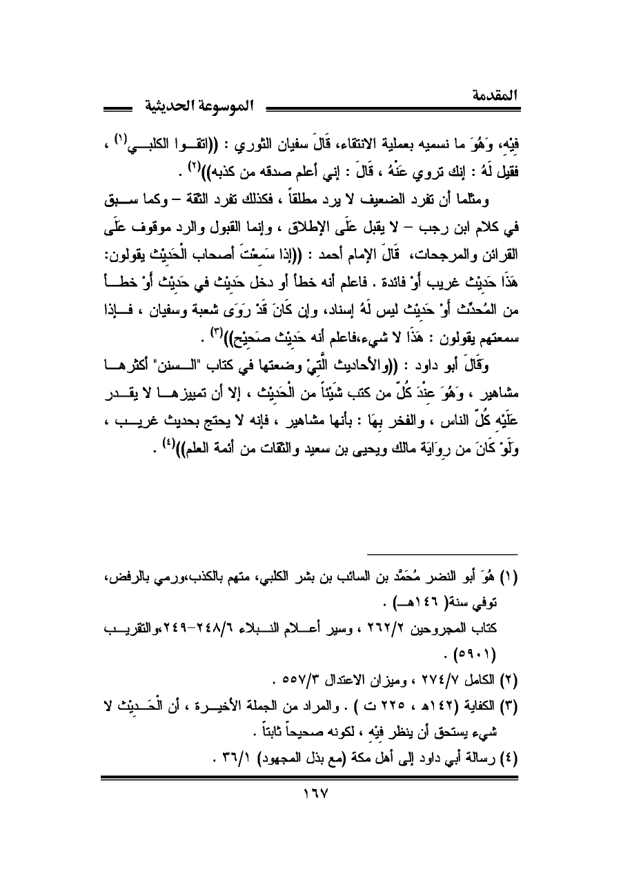 فِيْهِ، وَهُوَ ما نسميه بعملية الانتقاء، قَالَ سفيان الثوري: "اتقوا الكلبي (¬١)، فقيل لَهُ: إنك تروي عَنْهُ، قَالَ: إني أعلم صدقه من كذبه" (¬٢).