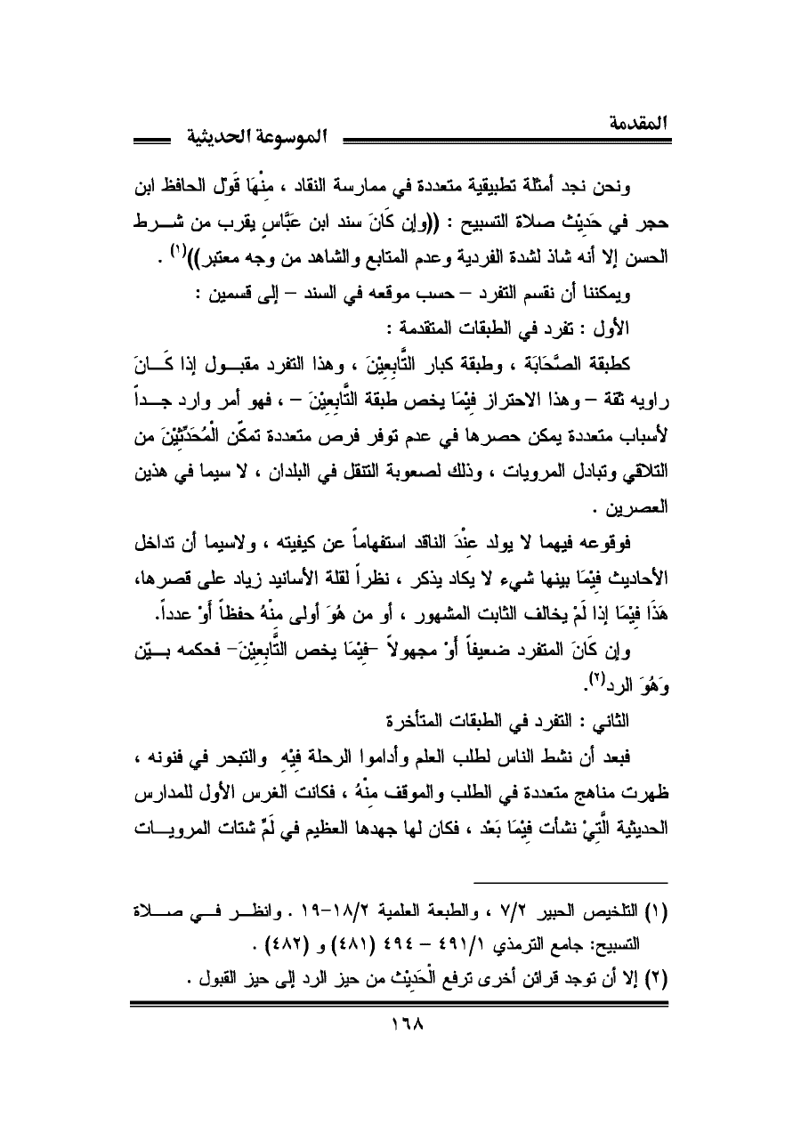 كطبقة الصَّحَابَة، وطبقة كبار التَّابِعِيْنَ، وهذا التفرد مقبول إذا كَانَ راويه ثقة - وهذا الاحتراز فِيْمَا يخص طبقة التَّابِعِيْنَ -، فهو أمر وارد جدًّا لأسباب متعددة يمكن حصرها في عدم توفر فرص متعددة تمكّن الْمُحَدِّثِيْنَ من التلاقي وتبادل المرويات، وذلك لصعوبة التنقل في البلدان، لا سيما في هذين العصرين.