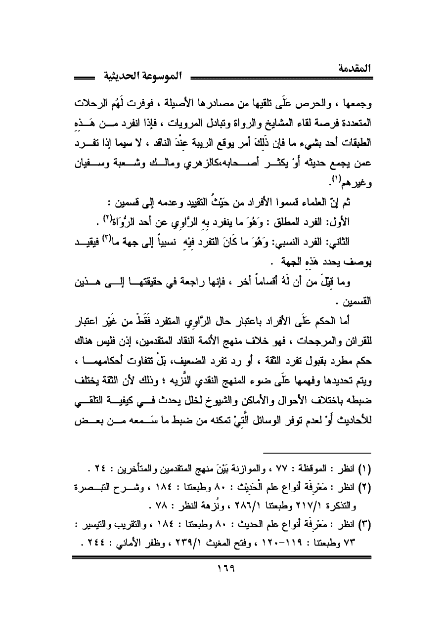 وجمعها، والحرص علَى تلقيها من مصادرها الأصيلة، فوفرت لَهُم الرحلات المتعددة فرصة لقاء المشايخ والرواة وتبادل المرويات، فإذا انفرد من هَذِهِ الطبقات أحد بشيء ما فإن ذَلِكَ أمر يوقع الريبة عِنْدَ الناقد، لا سيما إذا تفرد عمن يجمع حديثه أوْ يكثر أصحابه، كالزهري ومالك وشعبة وسفيان وغيرهم (¬١).