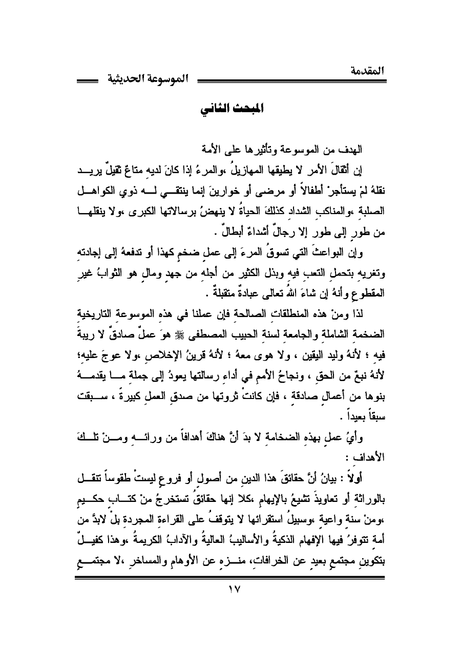 لذا ومنْ هذه المنطلقاتِ الصالحةِ فإن عملنا في هذهِ الموسوعةِ التاريخيةِ الضخمةِ الشاملةِ والجامعةِ لسنةِ الحبيب المصطفى -صلى الله عليه وسلم- هوَ عملٌ صادقٌ لا ريبةَ فيهِ؛ لأنهُ وليد اليقين، ولا هوى معهُ؛ لأنهُ قرينُ الإخلاصِ، ولا عوجَ عليهِ؛ لأنهُ نبعٌ من الحقِ، ونجاحُ الأمم في أداءِ رسالتها يعودُ إلى جملةِ ما يقدمهُ بنوها من أعمالٍ صادقةٍ، فإن كانتْ ثروتها من صدقِ العملِ كبيرةً، سبقت سبقًا بعيدًا.