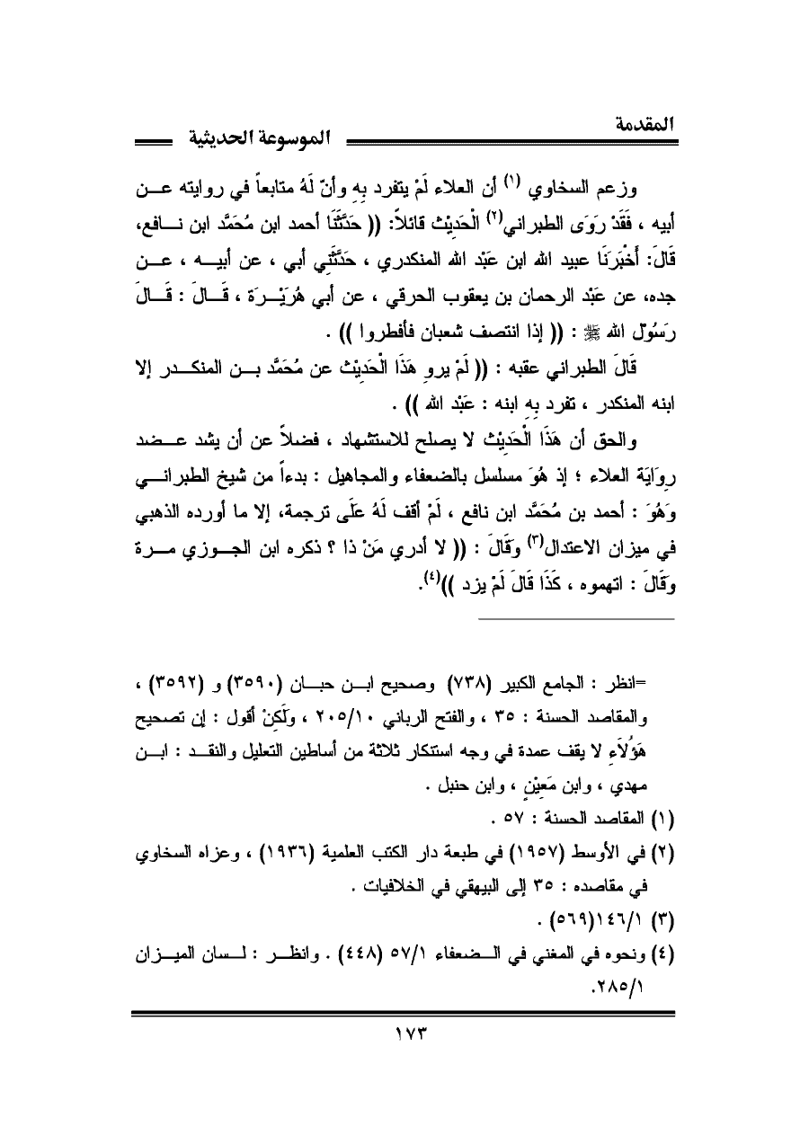 وزعم السخاوي (¬١) أن العلاء لَمْ يتفرد بِهِ وأنّ لَهُ متابعًا في روايته عن أبيه، فَقَدْ رَوَى الطبراني (¬٢) الْحَدِيْث قائلًا: "حَدَّثَنَا أحمد بن مُحَمَّد بن نافع، قَالَ: أخْبَرَنَا عبيد الله بن عَبْد الله المنكدري، حَدَّثَنِي أبي، عن أبيه، عن جده، عن عَبْد الرحمان بن يعقوب الحرقي، عن أبي هُرَيْرَة، قَالَ: قَالَ رَسُول الله - صلى الله عليه وسلم -: "إذا انتصف شعبان فافطروا".