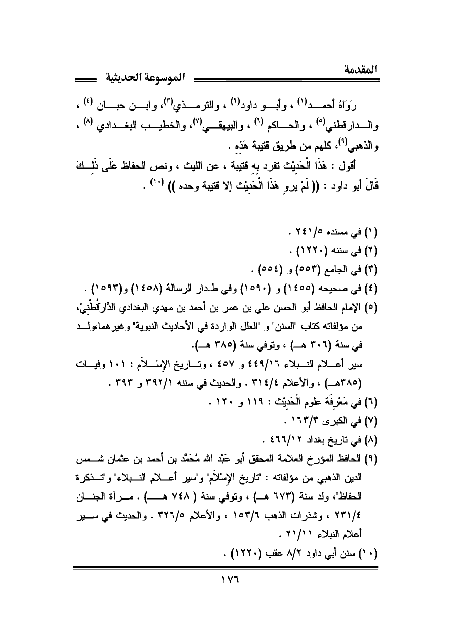 رَوَاهُ أحمد (¬١)، وأبو داود (¬٢)، والترمذي (¬٣)، وابن حبان (¬٤)، والدارقطني (¬٥)، والحاكم (¬٦)، والبيهقي (¬٧)، والخطيب البغدادي (¬٨)، والذهبي (¬٩)، كلهم من طريق قتيبة هَذِهِ.