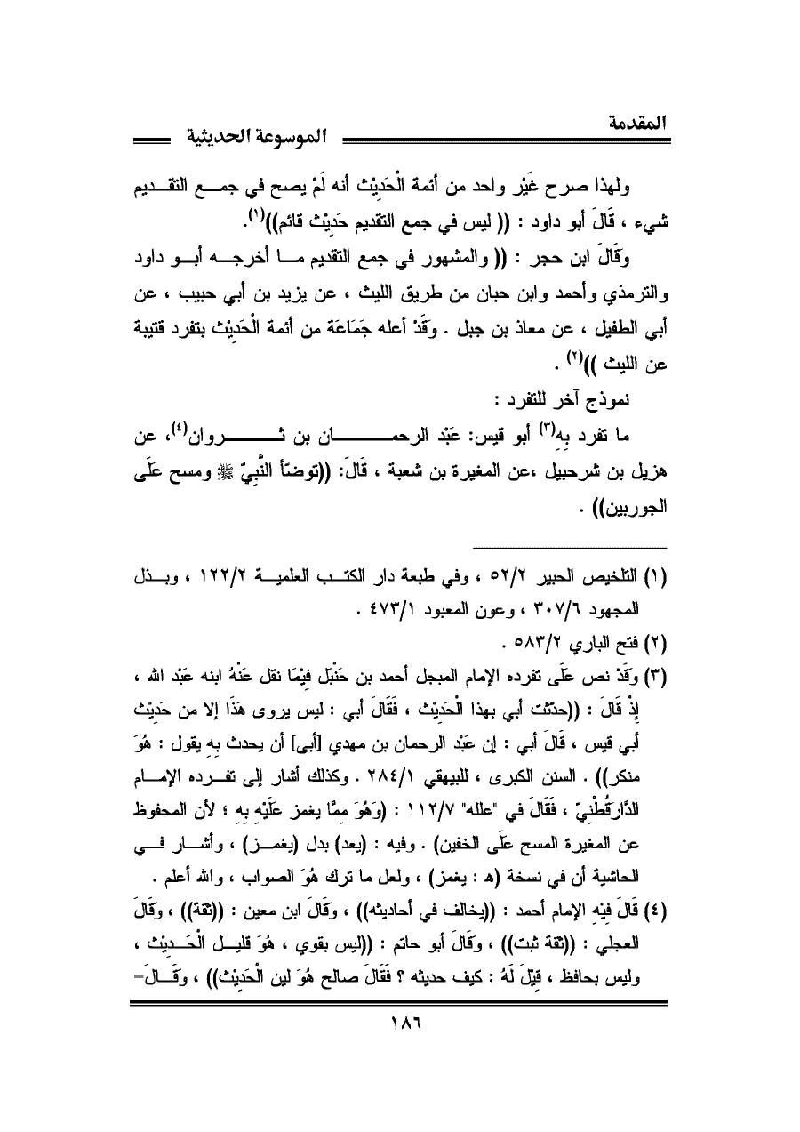 (¬٣) وقَدْ نص علَى تفرده الإمام المبجل أحمد بن حَنْبل فِيْمَا نقل عَنْه ابنه عَبْد الله، إِذ قَالَ: "حدّثت أبى بهذا الْحَدِيث، فَقَالَ أبي: ليس يروى هَذَا إلا من حَدِيْث أبى قيس، قَالَ أبي: إن عَبْد الرحمان بن مهدي [أبى] أن يحدث بِهِ يقول: هُوَ منكر". السنن الكبرى، للبيهقي ١/ ٢٨٤. وكذلك أشار إلى تفرده الإمام الدَّارقُطْنِيّ، فَقَالَ في "علله" ٧/ ١١٢: (وَهُوَ مِمَّا يغمز علَيْهِ بِهِ؛ لأن المحفوظ عن المغيرة المسح علَى الخفين). وفيه: (يعد) بدل (يغمز)، وأشار في الحاشية أن في نسخة (هـ: يغمز)، ولعل ما ترك هُوَ الصواب، والله أعلم.