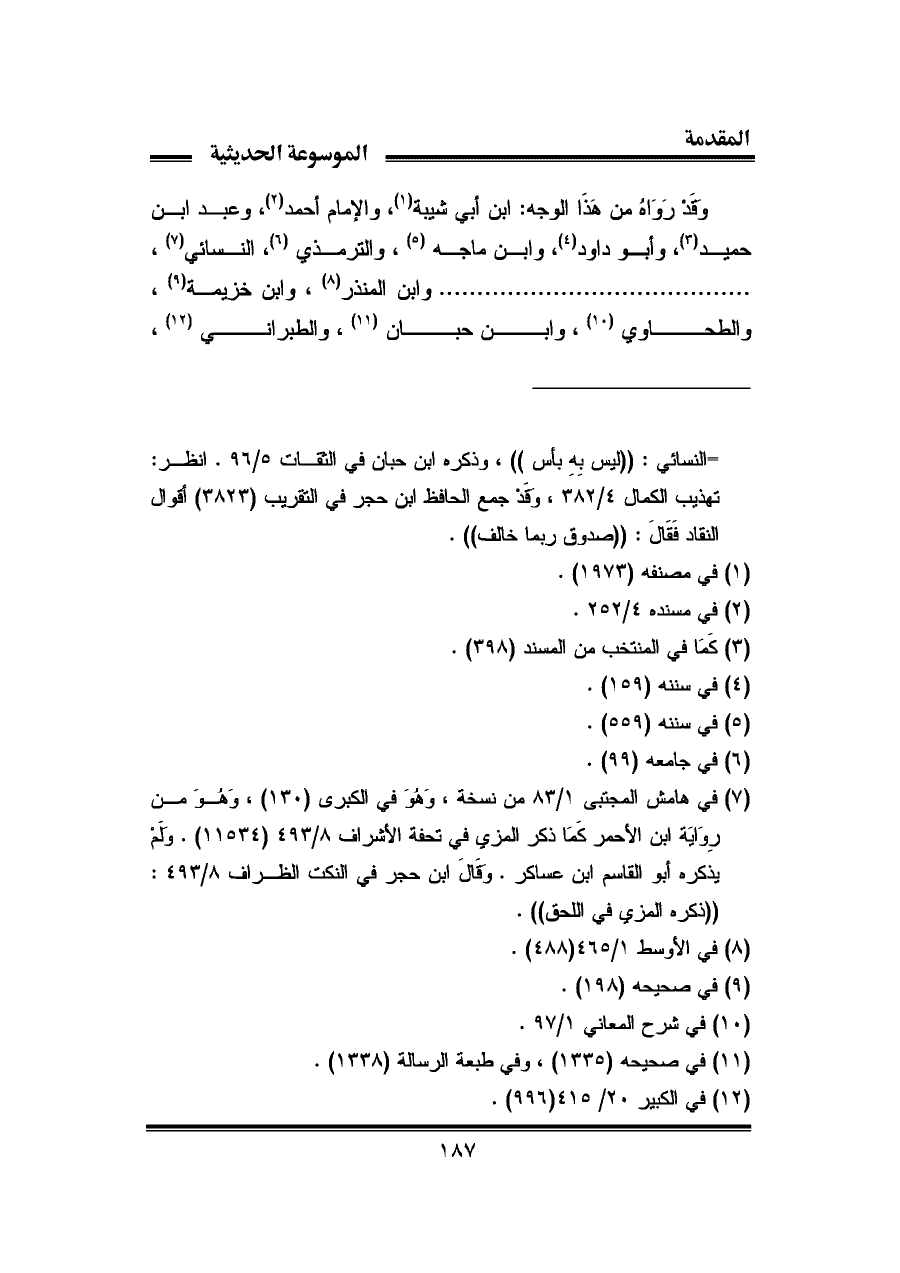 وَقَدْ رَوَاهُ من هَذَا الوجه: ابن أبي شيبة (¬١)، والإمام أحمد (¬٢)، وعبد بن حميد (¬٣)، وأبو داود (¬٤)، وابن ماجه (¬٥)، والترمذي (¬٦)، النسائي (¬٧)، ......................................... وابن المنذر (¬٨)، وابن خزيمة (¬٩)، والطحاوى (¬١٠)، وابن حبان (¬١١)، والطبراني (¬١٢)،