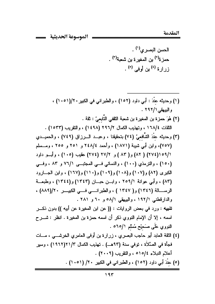 (¬٣) وحديثه عِندَ الشَّافِعِي (٧٤) بتحقيقنا، وعبد الرزاق (٧٤٩)، والحميدي (٧٥٧)، وابن أبى شيبة (١٨٧١)، وأحمد ٤/ ٢٤٨ و ٢٥١ و ٢٥٥، ومسلم ١/ ١٥٩ (٢٧٤) (٨٢) و (٨٣) و ٢/ ٢٧ (٢٧٤) عقيب (١٠٥)، وأبو داود (١٥٠)، والترمذي (١٠٠)، والنسائي في المجتبى ١/ ٧٦ و ٨٣، وفي الكبرى (٨٢) و (١٠٧) و (١٠٨) و (١٠٩) و (١١٠) و (١٦٧)، وابن الجارود (٨٣)، وأبي عوانة ١/ ٢٥٩، وابن حبان (١٣٤٣) و (١٣٤٤)، وطبعة الرسالة (١٣٤٦) و (١٣٤٧)، والطبراني في الكبير ٢٠/ (٨٨٩)، والدارقطني ١/ ١٩٢، والبيهقي ١/ ٥٨ و ٦٠ و ٢٨١.