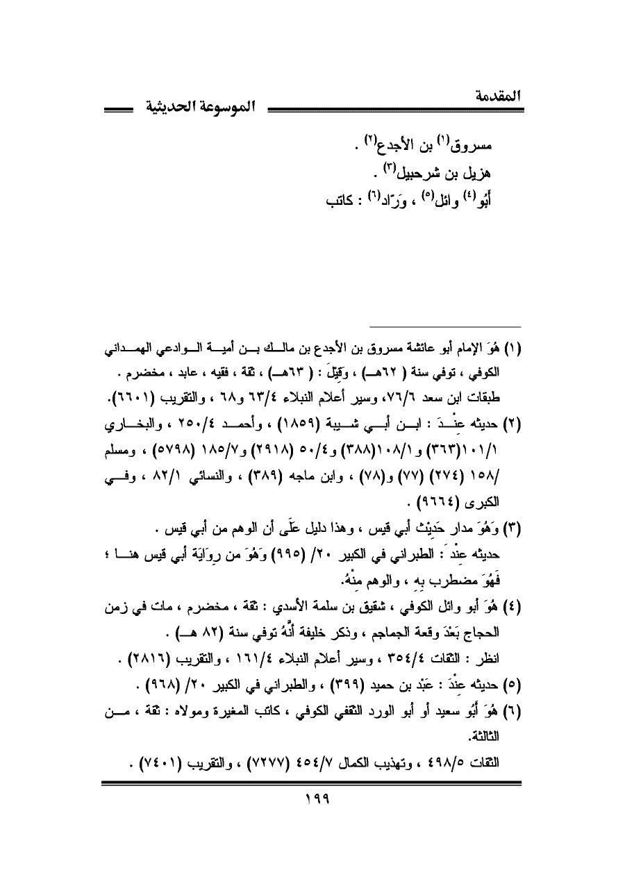 (¬١) هُوَ الإمام أبو عائشة مسروق بن الأجدع بن مالك بن أمية الوادعي الهمداني الكوفي، توفي سنة (٦٢ هـ)، وقِيْلَ: (٦٣ هـ)، ثقة، فتيه، عابد، مخضرم.