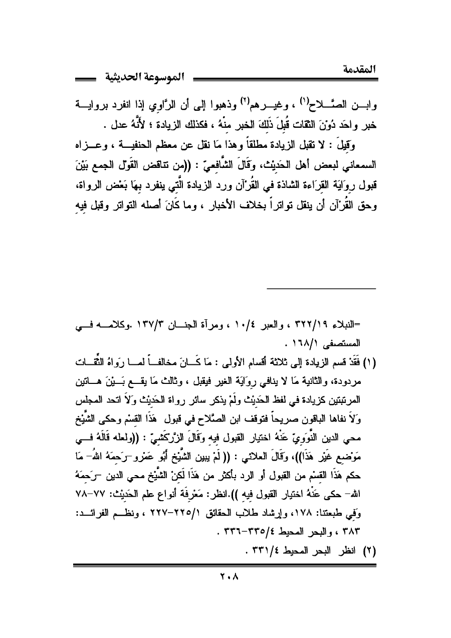 (¬١) فَقَدْ قسم الزيادة إلى ثلاثة أقسام الأولى: مَا كَانَ مخالفًا لما رَواة الثِّقات مردودة، والثانية مَا لا ينافي رِوَايَة الغير فيقبل، وثالث مَا يقع بَينَ هاتين المرتبتين كزيادة في لفظ الحَدِيث ولَمْ يذكر سائر رواة الحَدِيْثه وَلَا اتحد المجلس وَلَا نفاها الباقون صريحًا فتَوقف ابن الصلاح في قبول هَذَا القِسْم وحكى الشيْخ محيي الدين النَّوَوِيّ عَنهُ اختيار القبول فِيهِ وقَالَ الزرْكَشِي: "ولعله قالَهُ في مَوْضِع غَيْر هَذَا"، وقَالَ العلائي: "لَمْ يبين الشَّيْخ أَبُو عَمْرو - رحِمَه الله - مَا حكم هَذَا القِسْم من القبول أو الرد بأكثر من هَذَا لَكِنْ الشيْخ محيي الدين - رَحِمَة الله - حكى عَنْه اختيار القبول فِيهِ". انظر: مَعْرِفَة أنواع علم الحَدِيْث: ٧٧ - ٧٨ وَفِي طبعتنا: ١٧٨، وإرشاد طلاب الحقائق ١/ ٢٢٥ - ٢٢٧، ونظم الفرائد: ٣٨٣، والبحر المحيط ٤/ ٣٣٥ - ٣٣٦.