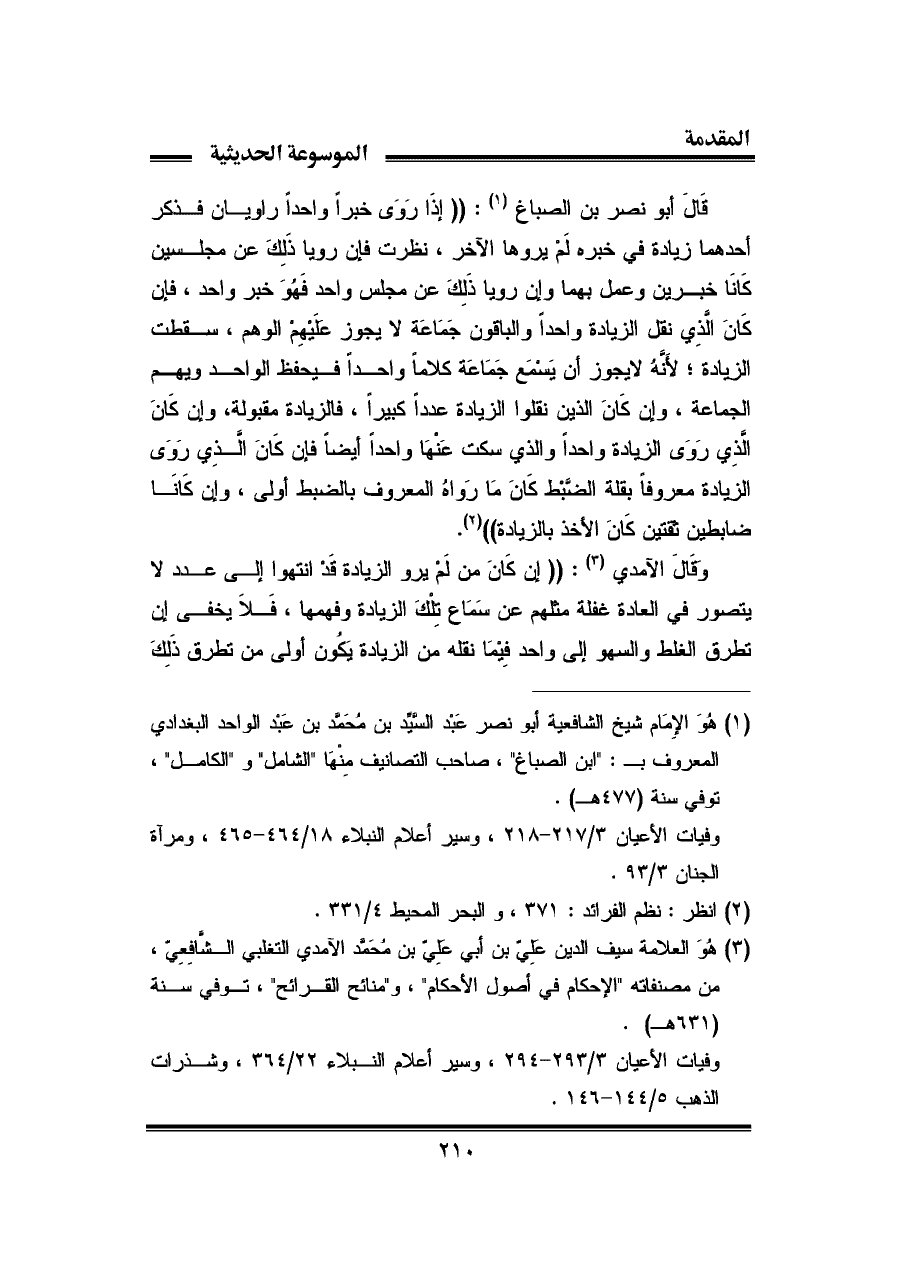 وقالَ الآمدي (¬٣): "إن كَانَ من لَمْ يرو الزيادة قَدْ انتهوا إلى عدد لا يتصور في العادة غفلة ملكلهم عن سَمَاع لكَ الزيادة وفهمها، فَلَا يخفى إن تطرق الغلط والسهو إلى واحد فِيْمَا نقله من الزيادة يَكُون أولى من تطرق ذَلِكَ