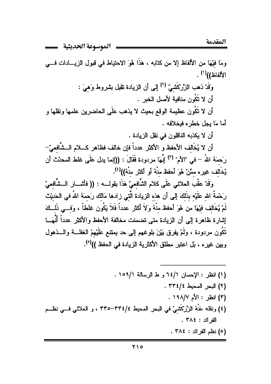 وَقَدْ عقّب العلائي علَى كلام الشَّافِعيّ هَذَا بقوله: "فأشار الشّافِعيّ رَحْمةُ اللهِ علَيْهِ بِذَلِكَ إلى أن هذِهِ الزيادة الّتِي زادها مَالِك رَحِمَهُ اللهُ في الحَدِيْث لَمْ يُخَالِف فِيْهَا من هُوَ أحفظ مِنْهُ وَلَا أكثر عددًا فَلَا يَكُون غلطًا، وَفِي ذَلكَ إشارة ظاهرة إلى أن الزيادة متى تضمنت مخالفة الأحفظ والأكثر عددًا أَنَّهَا تَكُون مردودة، وَلَمْ يفرق بَيْنَ بلوغهم إلى حد يمتنع علَيْهِمْ الغفلة والذهول وبين غيره، بَل اعتبر مطلق الأكثرية الزيادة في الحفظ" (¬٥).