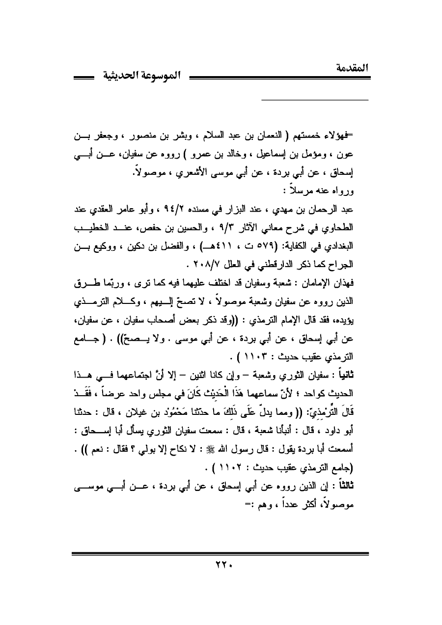 ثانيًا: سفيان الثورى وشعبة - وان كانا اثنين - إِلَّا أنّ اجتماعهما في هذا الحديث كواحد؛ لأنّ سماعهما هَذَا الْحَدِيْث كَانَ في مجلس واحد عرضًا، فَقَدْ قَالَ التِّرْمِذِيّ: "ومما يدلّ عَلَى ذَلِكَ ما حَدَّثَنَا مَحْمُوْد بن غيلان، قال: حَدَّثَنَا أبو داود، قال: أنبأنا شعبة، قال: سمعت سفيان الثوري يسأل أبا إسحاق: أسمعت أبا بردة يقول: قال رسول الله - صلى الله عليه وسلم -: لا نكاح إِلَّا بولي؟ فقال: نعم". (جامع الترمذي عقيب حديث: ١١٠٢).