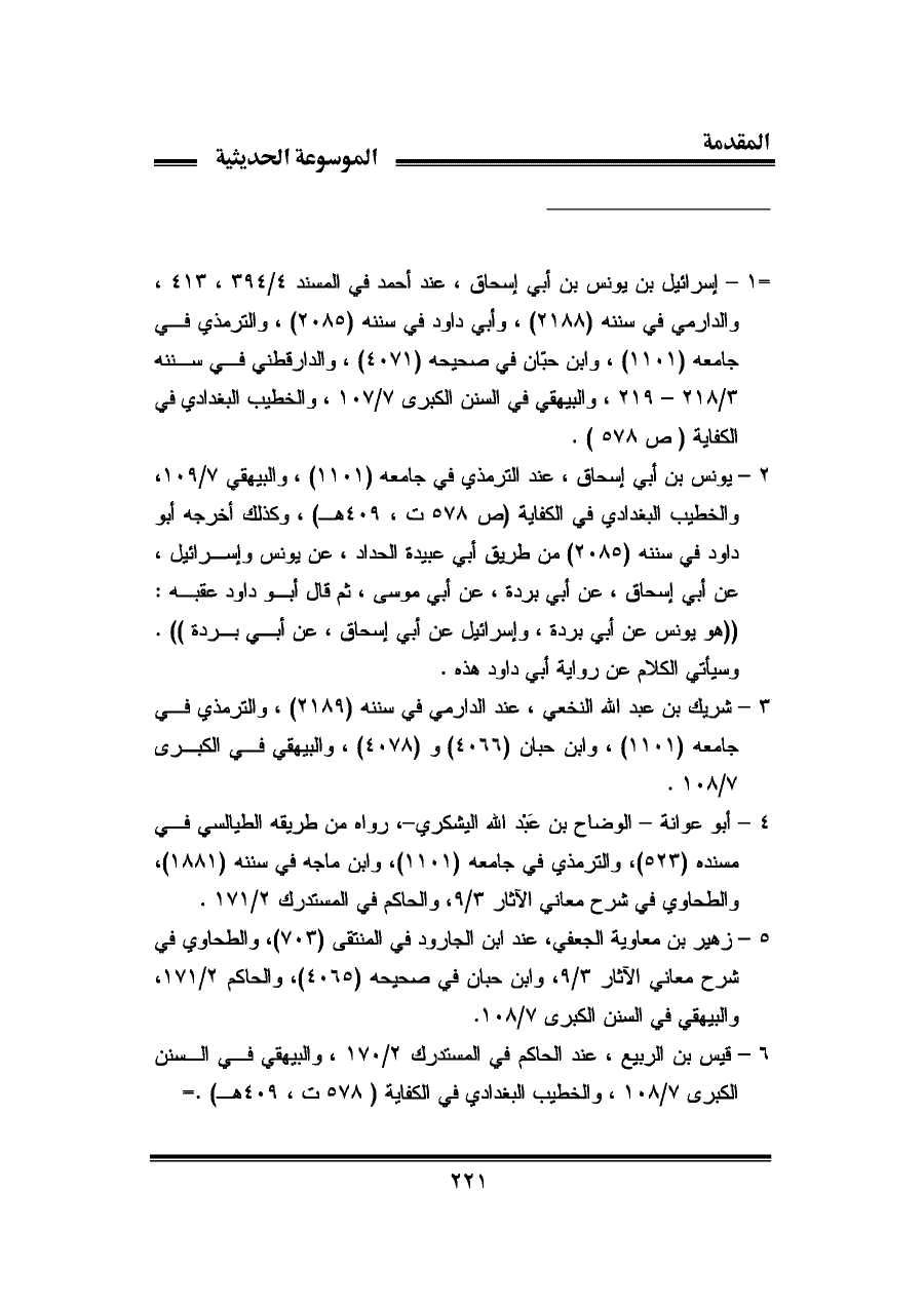 = ١ - إسرائيل بن يونس بن أبي إسحاق، عند أحمد في المسند ٤/ ٣٩٤، ٤١٣، والدارمي في سننه (٢١٨٨)، وأبي داود في سننه (٢٠٨٥)، والترمذى في جامعه (١١٠١)، وابن حبّان في صحيحه (٤٠٧١)، والدارقطنى في سننه ٣/ ٢١٨ - ٢١٩، والبيهقيّ في السنن الكبرى ٧/ ١٠٧، والخطيب البغدادى في الكفاية (ص ٥٧٨).