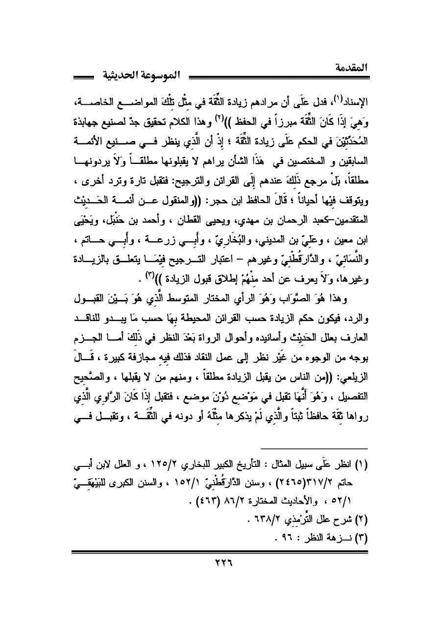 الإسناد (¬١)، فدل علَى أن مرادهم زيادة الثِّقَة في مِثْل تِلْكَ المواضع الخاصة، وَهِيَ إذَا كَانَ الثِّقة مبرزًا في الحفظ" (¬٢) وهذا الكلام تحقيق جدٌ لصنيع جهابذة المُحَدِّثِيْنَ في الحكم علَى زيادة الثِّقَة؛ إِذْ أن الَّذِي ينظر في صنيع الأئمة السابقين والمختصين في هَذَا الشأن يراهم لا يقبلونها مطلقًا وَلَا يردونها مطلقًا، بَلْ مرجع ذَلِكَ عندهم إِلَى القرائن والترجيح: فتقبل تارة وترد أخرى، ويتوقف فِيْها أحيانًا؛ قَالَ الحافظ ابن حجر: "والمنقول عن أئمة الحَدِيْث المتقدمين - كعبد الرحمان بن مهدي، ويحيى القطان، وأحمد بن حَنْبَل، ويَحْيَى بن معين، وعَلِيّ بن المديني، والبُخَارِيّ، وأَبِي زرعة، وأَبِي حاتم، والنَّسَائِيّ، والدَّارقُطْنِيّ وغيرهم - اعتبار الترجيح فِيْمَا يتعلق بالزيادة وغيرها، وَلَا يعرف عن أحد مِنْهُمْ إطلاق قبول الزيادة" (¬٣).