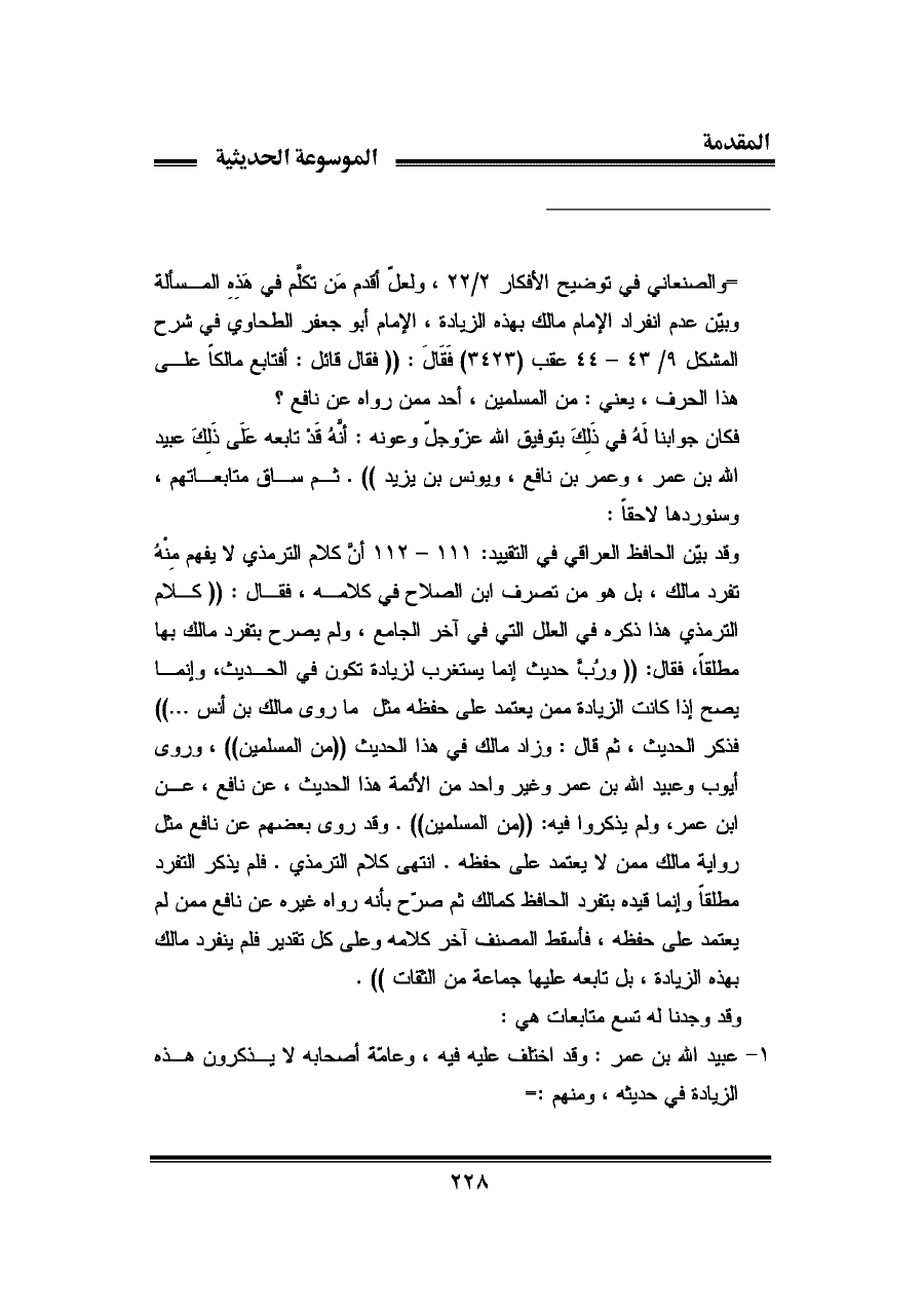 = والصنعانى في توضيح الأفكار ٢/ ٢٢، ولعلّ أقدم مَن تكلَّم في هَذِهِ المسألة وبيّن عدم انفراد الإمام مالك بهذه الزيادة، الإمام أبو جعفر الطحاوى في شرح المشكل ٩/ ٤٣ - ٤٤ عقب (٣٤٢٣) فَقَالَ: "فقال قائل: أفتابع مالكًا على هذا الحرف، يعني: من المسلمين، أحد ممن رواه عن نافع؟