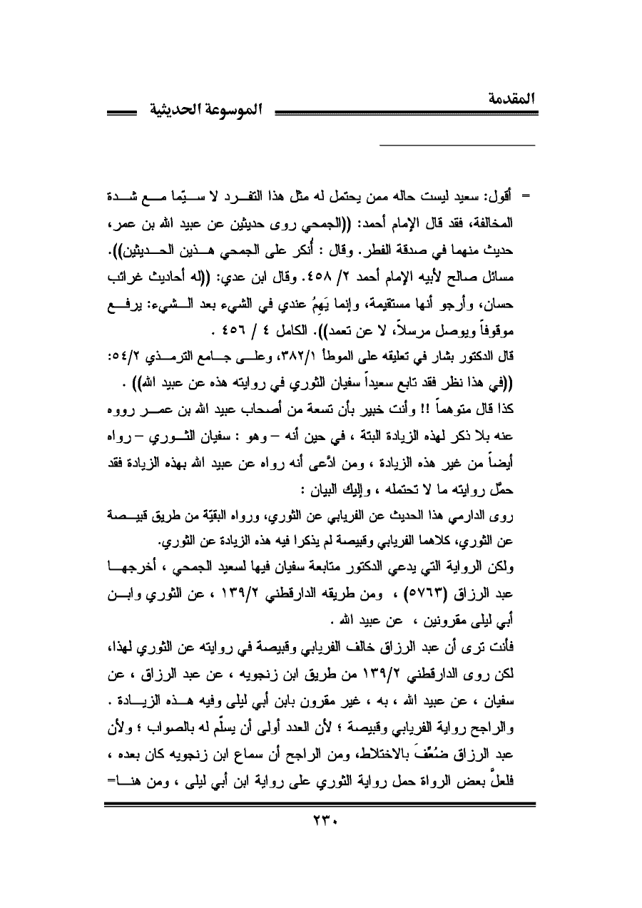 ولكن الرواية التى يدعي الدكتور متابعة سفيان فيها لسعيد الجمحي، أخرجها عبد الرزاق (٥٧٦٣)، ومن طريقه الدارقطنى ٢/ ١٣٩، عن الثوري وابن أبي ليلى مقرونين، عن عبيد الله.