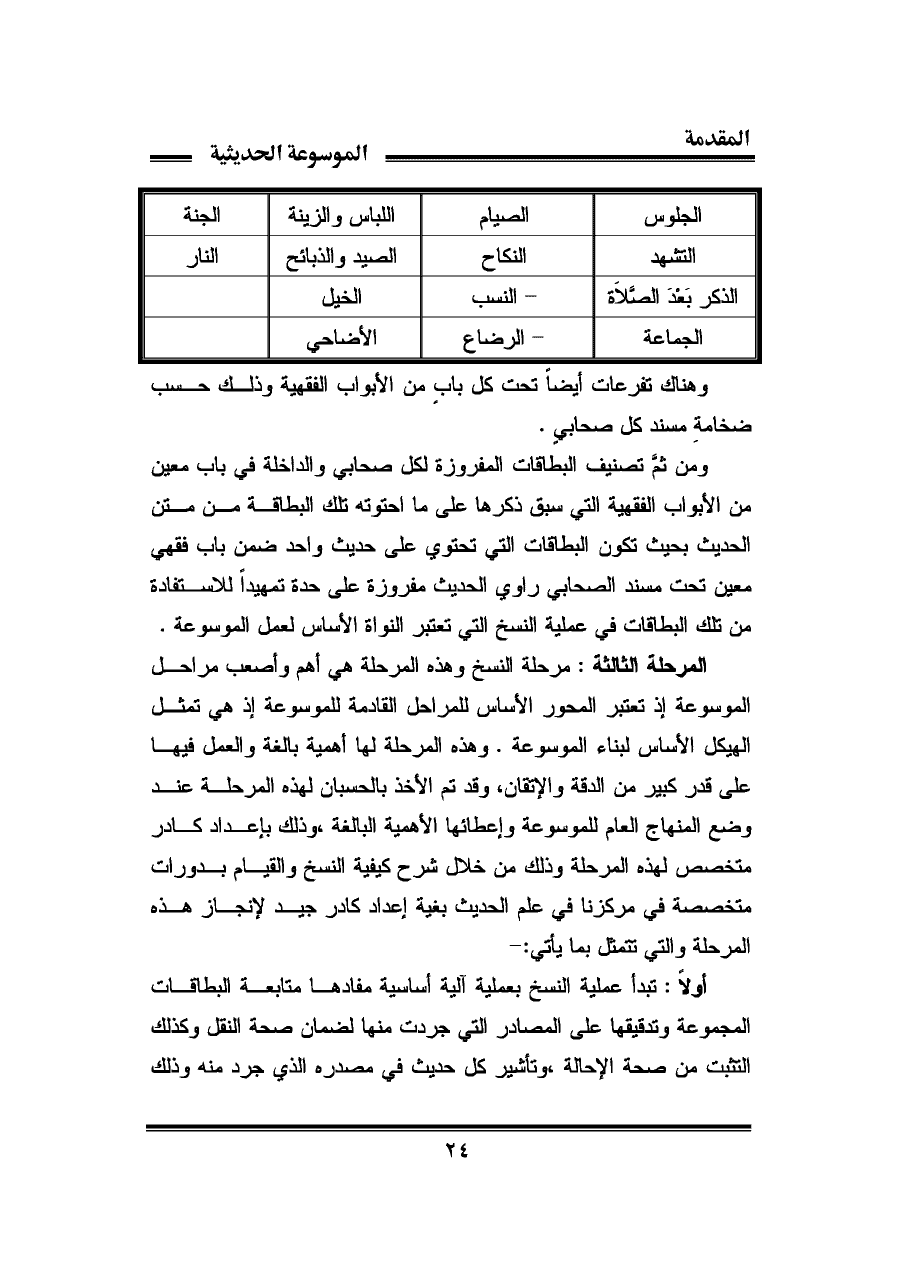 المرحلة الثالثة: مرحلة النسخ وهذه المرحلة هي أهم وأصعب مراحل الموسوعة إذ تعتبر المحور الأساس للمراحل القادمة للموسوعة إذ هي تمثل الهيكل الأساس لبناء الموسوعة. وهذه المرحلة لها أهمية بلغة والعمل فيها على قدر كبير من الدقة والإتقان، وقد تم الأخذ بالحسبان لهذه المرحلة عند وضع المنهاج العام للموسوعة وإعطائها الأهمية البالغة، وذلك بإعداد كادر متخصص لهذه المرحلة وذلك من خلال شرح كيفية النسخ والقيام بدورات متخصصة في مركزنا في علم الحديث بغية إعداد كادر جيد لإنجاز هذه المرحلة والتي تتمثل بما يأتي:-