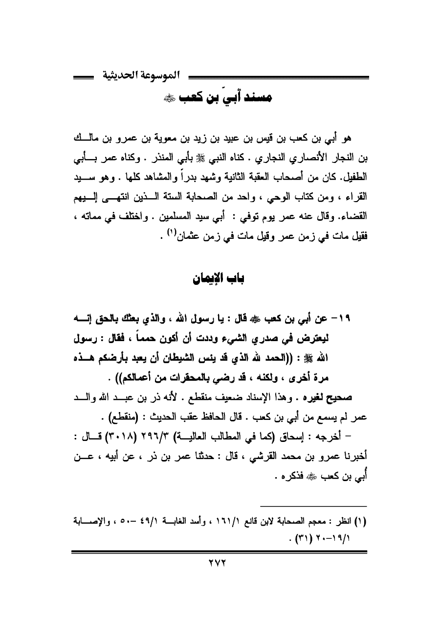 ١٩ - عن أبى بن كعب - رضي الله عنه - قال: يا رسول الله، والذي بعثك بالحق إنه ليعترض في صدري الشئ وددت أن أكون حممًا، فقال: رسول الله - صلى الله عليه وسلم -: ((الحمد للّه الذي قد يئس الشيطان أن يعبد بأرضكم هذه مرة أخرى، ولكنه، قد رضى بالمحقرات من أعمالكم)).