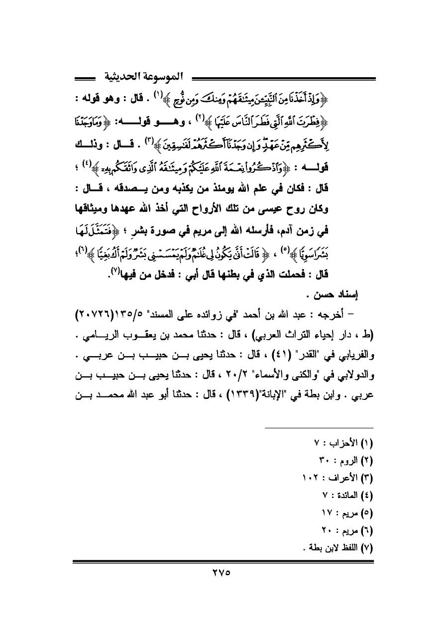 {وَإِذْ أَخَذْنَا مِنَ النَّبِيِّينَ مِيثَاقَهُمْ وَمِنْكَ وَمِنْ نُوحٍ} (¬١). قال: وهو قوله: {فِطْرَتَ اللَّهِ الَّتِي فَطَرَ النَّاسَ عَلَيْهَا} (¬٢)، وهو قوله: {وَمَا وَجَدْنَا لِأَكْثَرِهِمْ مِنْ عَهْدٍ وَإِنْ وَجَدْنَا أَكْثَرَهُمْ لَفَاسِقِينَ} (¬٣). قال: وذلك قوله: {وَاذْكُرُوا نِعْمَةَ اللَّهِ عَلَيْكُمْ وَمِيثَاقَهُ الَّذِي وَاثَقَكُمْ بِهِ} (¬٤)؛ قال: فكان في علم الله يومئذ من يكذبه ومن يصدقه، قال: وكان روح عيسى من تلك الأرواح التى أخذ الله عهدها وميثاقها في زمن آدم، فأرسله الله إلى مريم في صورة بشرِ؛ {فَتَمَثَّلَ لَهَا بَشَرًا سَوِيًّا} (¬٥)، {قَالَتْ أَنَّى يَكُونُ لِي غُلَامٌ وَلَمْ يَمْسَسْنِي بَشَرٌ وَلَمْ أَكُ بَغِيًّا} (¬٦)؛ قال: فحملت الذي في بطنها قال أبى: فدخل من فيها (¬٧).
