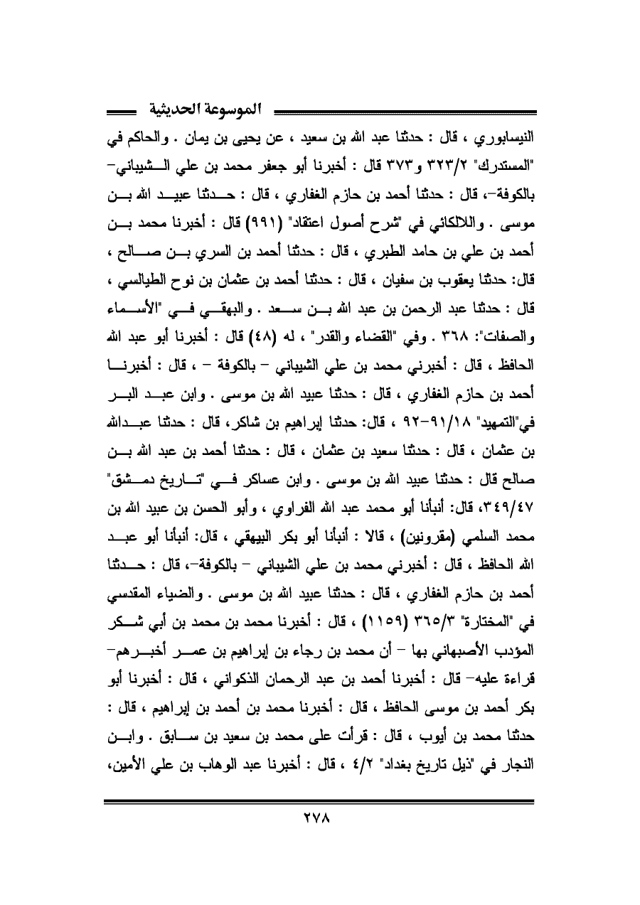 النيسابوري، قال: حدثنا عبد الله بن سعيد، عن يحيى بن يمان. والحاكم في "المستدرك" ٢/ ٣٢٣ و ٣٧٣ قال: أخبرنا أبو جعفر محمد بن علي الشيباني - بالكوفة -، قال: حدثنا أحمد بن حازم الغفاري، قال: حدثنا عبيد الله بن موسى. واللالكائي في "شرح أصول اعتقاد" (٩٩١) قال: أخبرنا محمد بن أحمد بن علي بن حامد الطبري، قال: حدثنا أحمد بن السري بن صالح، قال: حدثنا يعقوب بن سفيان، قال: حدثنا أحمد بن عثمان بن نوح الطيالسي، قال: حدثنا عبد الرحمن بن عبد الله بن سعد. والبيهقي في "الأسماء والصفات": ٣٦٨. وفي "القضاء والقدر"، له (٤٨) قال: أخبرنا أبو عبد الله الحافظ، قال: أخبرني محمد بن علي الشيباني - بالكوفة -، قال: أخبرنا أحمد بن حازم الغفاري، قال: حدثنا عبيد الله بن موسى. وابن عبد البر في "التمهيد" ١٨/ ٩١ - ٩٢، قال: حدثنا إبراهيم بن شاكر، قال: حدثنا عبد الله بن عثمان، قد: حدثنا سعيد بن عثمان، قال: حدثنا أحمد بن عبد الله بن صالح قد: حدثنا عبيد الله بن موسى. وابن عساكر في "تاريخ دمشق" ٤٧/ ٣٤٩، قال: أنبأنا أبو محمد عبد الله الفراوي، وأبو الحسن بن عبيد الله بن محمد السلمي (مقرونين)، قالا: أنبأنا أبو بكر البيهقي، قال: أنبأنا أبو عبد الله الحافظ، قال: أخبرني محمد بن علي الشيباني - بالكوفة -، قال: حدثنا أحمد بن حازم الغفاري، قال: حدثنا عبيد الله بن موسى. والضياء المقدسي في "المختارة" ٣/ ٣٦٥ (١١٥٩)، قال: أخبرنا محمد بن محمد بن أبي شكر المؤدب الأصبهاني بها - أن محمد بن رجاء بن إبراهيم بن عمر أخبرهم - قراءة عليه - قال: أخبرنا أحمد بن عبد الرحمان الذكواني، قال: أخبرنا أبو بكر أحمد بن موسى الحافظ، قال: أخبرنا محمد بن أحمد بن إبراهيم، قال: حدثنا محمد بن أيوب، قد: قرأت على محمد بن سعيد بن سابق. وابن النجار في "ذيل تاريخ بغداد" ٢/ ٤، قال: أخبرنا عبد الوهاب بن علي الأمين،