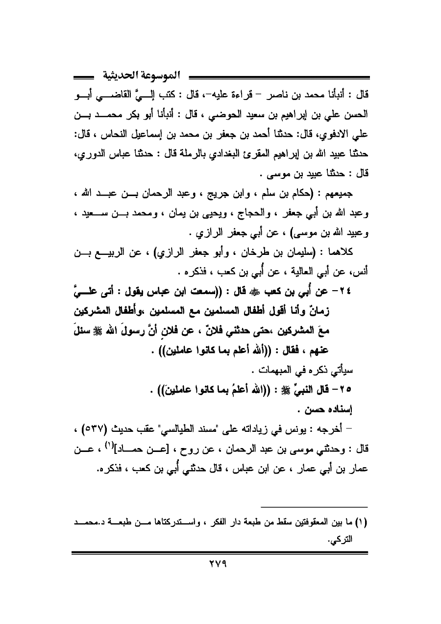 ٢٤ - عن أبي بن كعب - رضي الله عنه - قال: ((سمعت ابن عباس يقول: أتى عليّ زمانٌ وأنا أقول أطفال المسلمين مع المسلمين، وأَطفال المشركين معَ المشركين، حتى حدثني فلان، عن فلانٍ أنَّ رسولَ الله - صلى الله عليه وسلم - سئلَ عنهم، فقال: ((اللّه أعلم بما كانوا عاملين)).