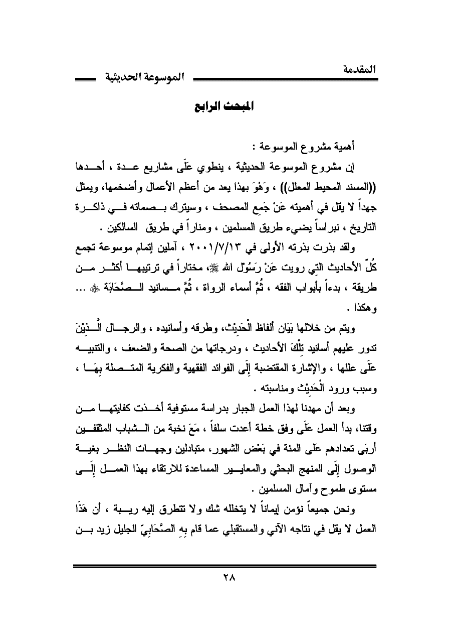 إن مشروع الموسوعة الحديثية، ينطوي علَى مشاريع عدة، أحدها "المسند المحيط المعلل"، وَهُوَ بهذا يعد من أعظم الأعمال وأضخمها، ويمثل جهدًا لا يقل في أهميته عَنْ جَمِع المصحف، وسيترك بصماته في ذاكرة التاريخ، نبراسًا يضيء طريق المسلمين، ومنارًا في طريق السالكين.