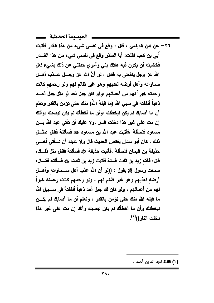 ٢٦ - عن ابن الديلمى، قال: وقع في نفسى شيء من هذا القدر فأتيت أَبى بن كعب فقلت: أبا المنذر وقع في نفسي شيء من هذا القدر فخشيت أن يكون فيه هلاك بنى وأَمري حدثني عن ذلك بشئ لعل الله عز وجل ينفعني به فقال: لو أَنَّ الله عز وجل عذب أهل سماواته وأهل أرضه لعذبهم وهو غير ظالم لهم ولو رحمهم كانت رحمته خيرًا لهم من أعمالهم، ولو كان جبل أحد أَو مثل جبل أَحد ذهبًا أنفعته في سبي الله (ما قبلهُ اللّهُ) منك حتى تؤمن بالقدر وتعلم أن ما أصابك لم يكن ليخطئك، وان ما أخطأك لم يكن ليصبك، وأنك إن مت على غير هذا دخلت النار، ولا عليك أن تأتي عبد الله بن مسعود فتسألهُ، فأتيت عبد الله بن مسعود - رضي الله عنه - فسألتهُ فقال: مثل ذلك. كان أبو سنان يقتص الحديث قال ولا عليك أن تأتى أخى حذيفة بن اليمان فتسألهُ، فأتيت حذيفة - رضي الله عنه - فسألتهُ فقال مثل ذلك، قال: فآتِ زيد بن ثابت فسلهُ فأتيت زيد بن ثابت - رضي الله عنه - فسألته فقال: سمعت رسول - صلى الله عليه وسلم - يقول: ((لو أَن الله عذب أَهل سماواتهِ وأهل أرضهِ لعذبهم وهو غير ظالم لهم، ولو رحمهم كانت رحمتهُ خيرًا لهم من أعمالهم، ولو كان لك جبل أحد ذهبًا أنفقتهُ في سبيل الله ما قبله الله مند حتى تؤمن بالقدر، وتعلم أن ما أصابك لم يكن ليخطئك وأن ما أخطأك لم يكن ليصيبك وأنك إن مت على غير هذا دخلت النار)) (¬١).
