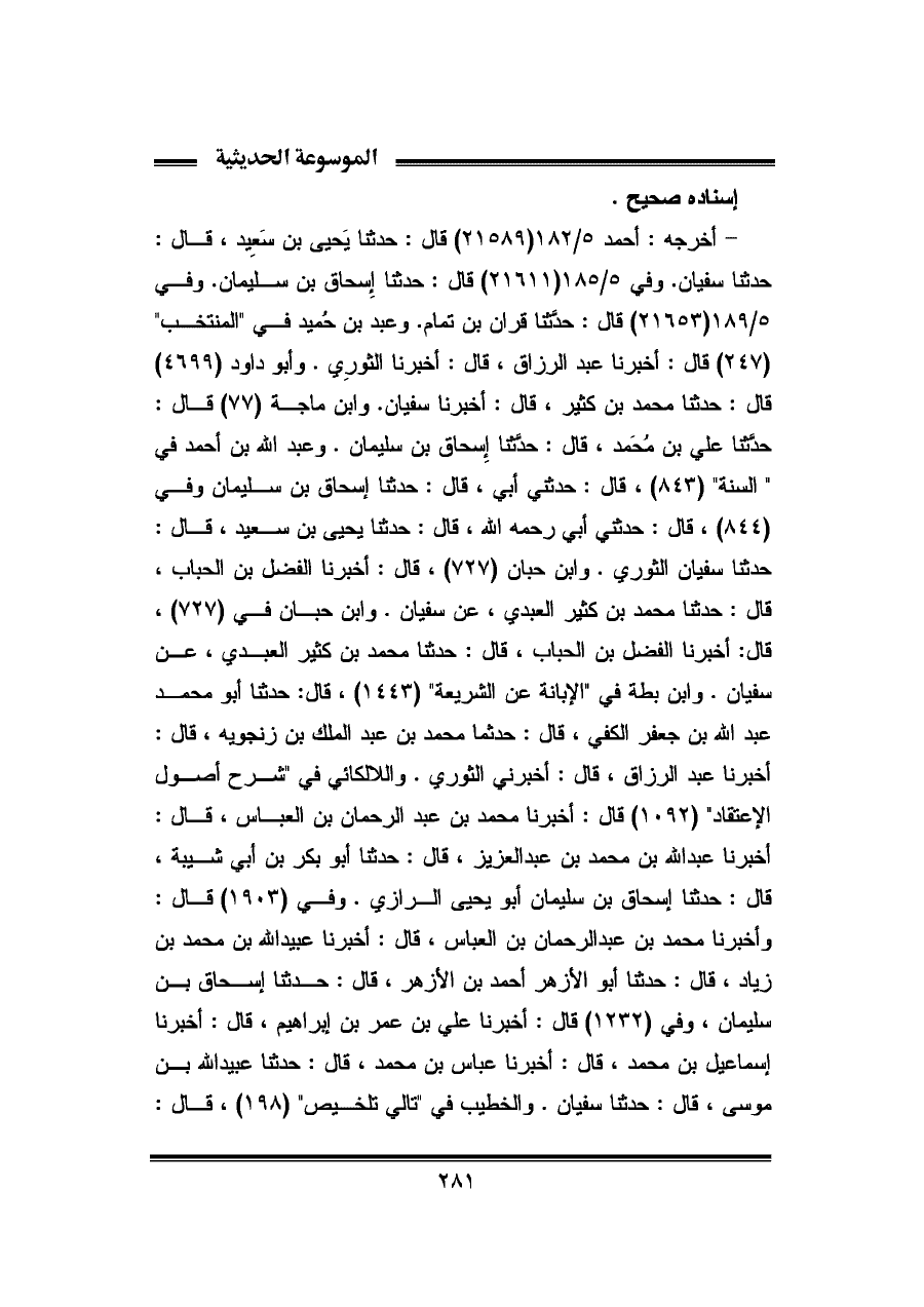 - أخرجه: أحمد ٥/ ١٨٢ (٢١٥٨٩) قال: حدثنا يَحيى بن سَعِيد، قال: حدثنا سفيان. وفي ٥/ ١٨٥ (٢١٦١١) قال: حدثنا إِسحاق بن سليمان. وفي ٥/ ١٨٩ (٢١٦٥٣) قال: حدثنا قران بن تمام. وعبد بن حُميد في "المنتخب" (٢٤٧) قال: أخبرنا عبد الرزاق، قال: أخبرنا الثورِي. وأبو داود (٤٦٩٩) قال: حدثنا محمد بن كثير، قال: أخبرنا سفيان. وابن ماجة (٧٧) قال: حدثنا علي بن مُحَمد، قال: حدثنا إِسحاق بن سليمان. وعبد الله بن أحمد في "السنة" (٨٤٣)، قال: حدثني أبي، قال: حدثنا إسحاق بن سليمان وفي (٨٤٤)، قال: حدثني أبي رحمه الله، قال: حدثنا يحيى بن سعيد، قال: حدثنا سفيان الثوري. وابن حبان (٧٢٧)، قال: أخبرنا الفضل بن الحباب، قال: حدثنا محمد بن كثير العبدي، عن سفيان. وابن حبان في (٧٢٧)، قال: أخبرنا الفضل بن الحباب، قال: حدثنا محمد بن كثير العبدي، عن سفيان. وابن بطة في "الإبانة عن الشريعة" (١٤٤٣)، قال: حدثنا أبو محمد عبد الله بن جعفر الكفي، قد: حدثنا محمد بن عبد الملك بن زنجويه، قال: أخبرنا عبد الرزاق، قال: أخبرني الثوري. واللالكائي في "شرح أصول الإعتقاد" (١٠٩٢) قال: أخبرنا محمد بن عبد الرحمان بن العباس، قال: أخبرنا عبد الله بن محمد بن عبد العزيز، قال: حدثنا أبو بكر بن أبي شيبة، قال: حدثنا إسحاق بن سليمان أبو يحيى الرازي. وفي (١٩٠٣) قال: وأخبرنا محمد بن عبد الرحمان بن العباس، قال: أخبرنا عبيد الله بن محمد بن زياد، قال: حدثنا أبو الأزهر أحمد بن الأزهر، قال: حدثنا إسحاق بن سليمان، وفي (١٢٣٢) قال: أخبرنا علي بن عمر بن إبراهيم، قال: أخبرنا إسماعيل بن محمد، قال: أخبرنا عباس بن محمد، قال: حدثنا عبيد الله بن موسى، قال: حدثنا سفيان. والخطيب في "تالي تلخيص" (١٩٨)، قال: